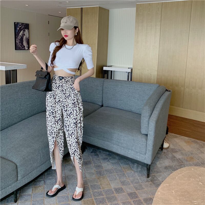 スタイルサマーラウンドネックショートTシャツ ハイウェストウェストレオパードカジュアルパンツ 夏物 Oネック ハンチェンe33323930525