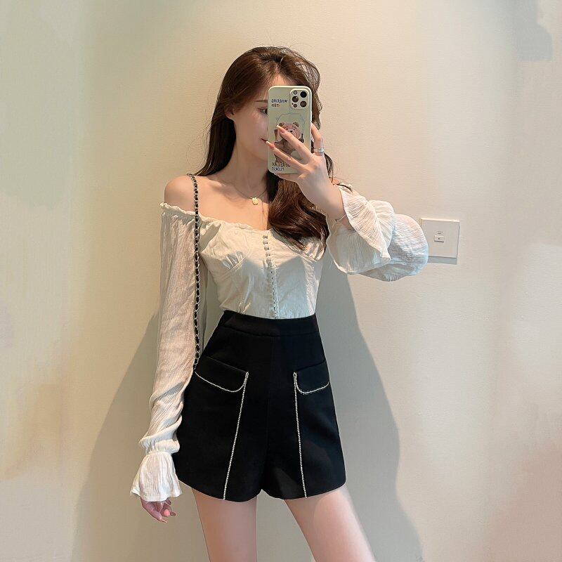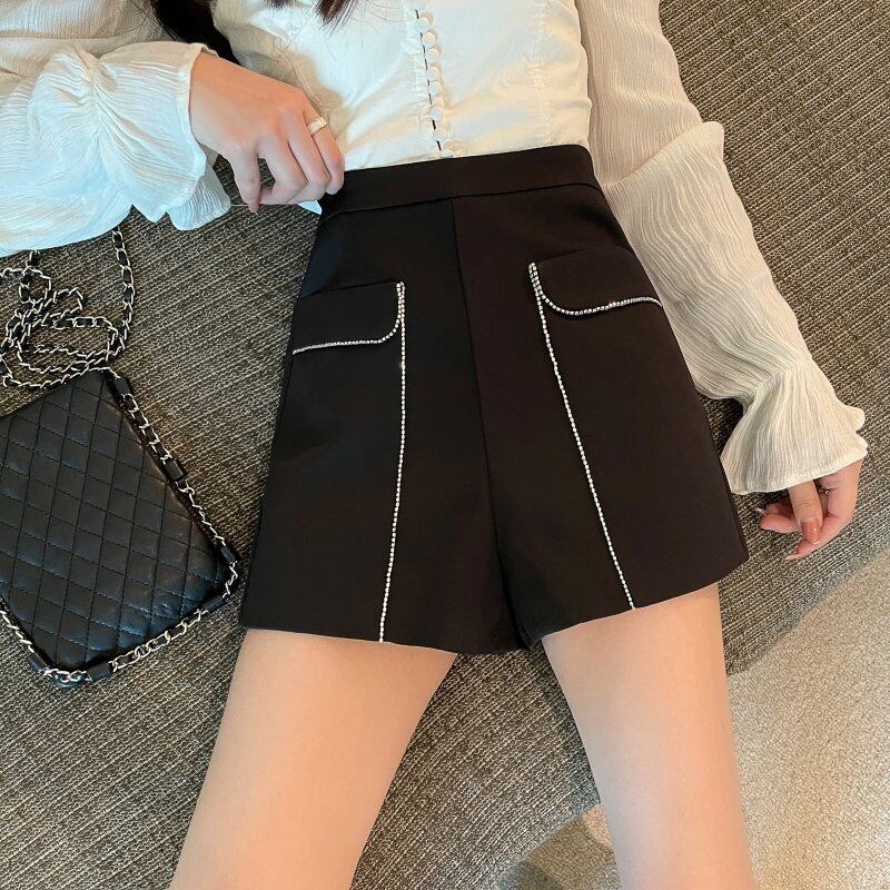 サマースタイルハイウェストウェストルーズワイドレッグブラックAラインカジュアルパンツ ショーツ 夏物 ブルマー ワイドパンツ ハンチェンe49689257247