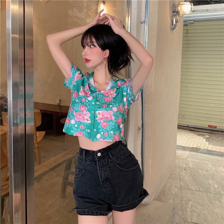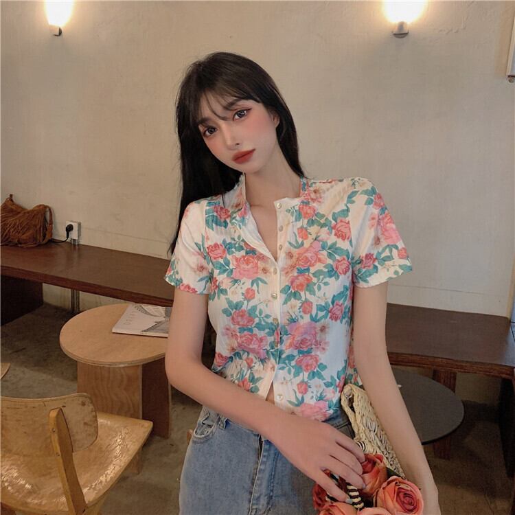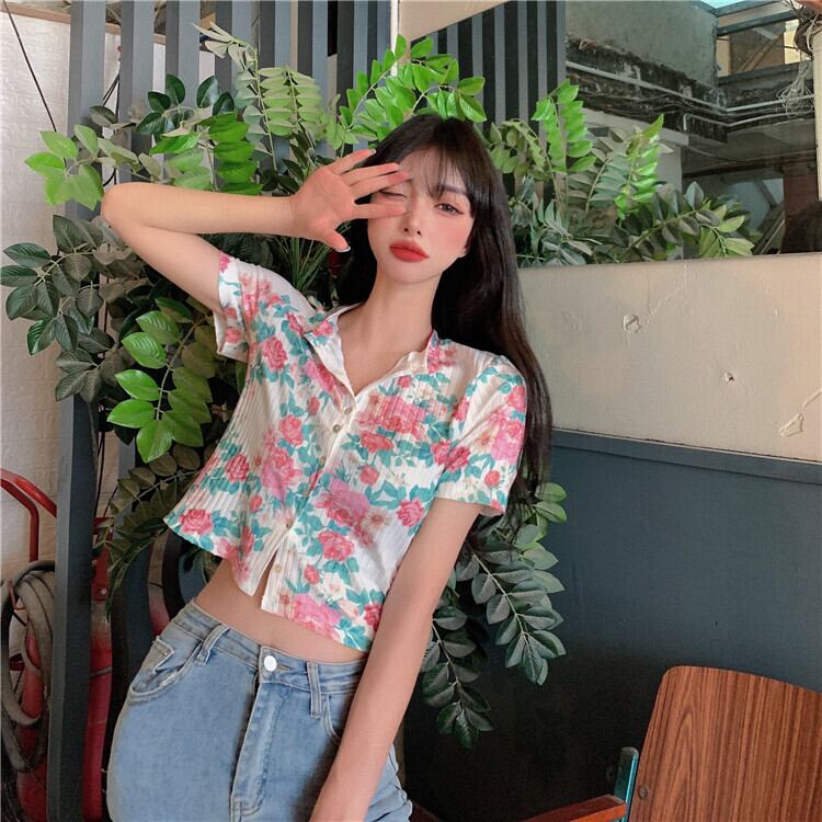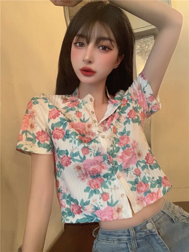 サマースタンダードフローラルスリムクロップドトップス レディース レトロ 夏物 花柄 ハンチェンe32158311484