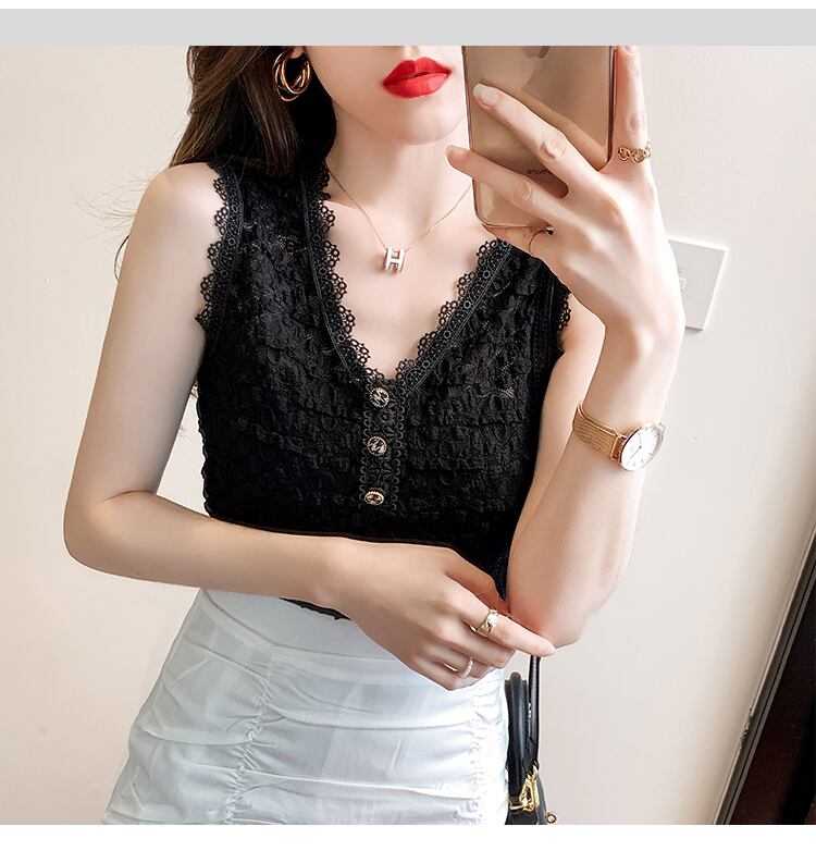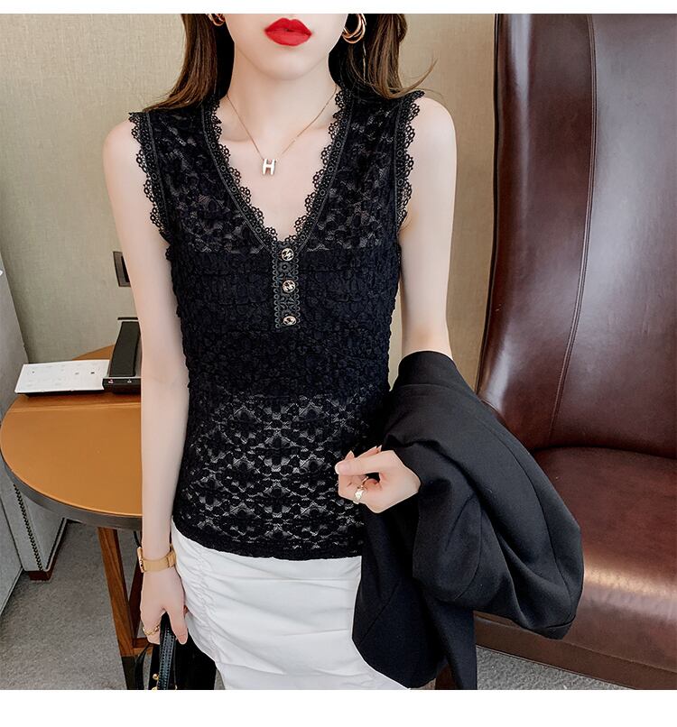 サマースタイルVネックスリムレースシャツ ノースリーブトップス 夏物 ハンチェンe2704053593
