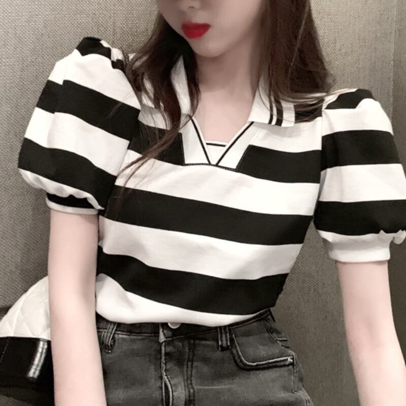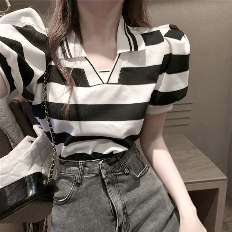 サマースタイルスリーブルーズ薄手カラーストライプTシャツ トップス 夏物 ハンチェンe3539549335