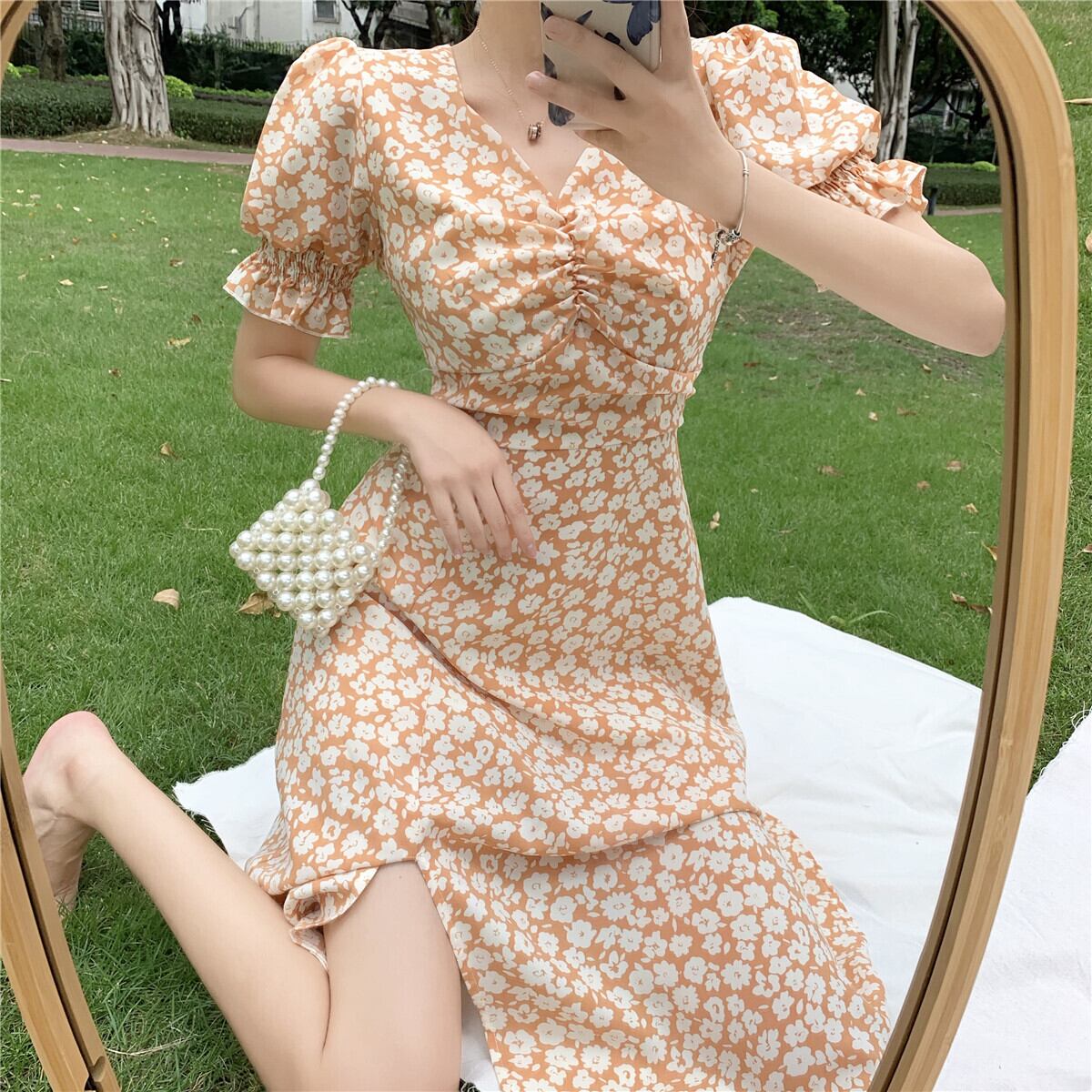 スタンダードミディスカート サマースタイルスリーブ薄手フローラルドレス レトロ 夏物 花柄 ハンチェンe26240993871