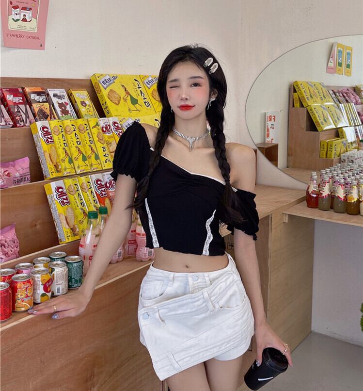 ショートトップス サマースリムレースTシャツ 夏物 ステッチ ハンチェンe98526837367