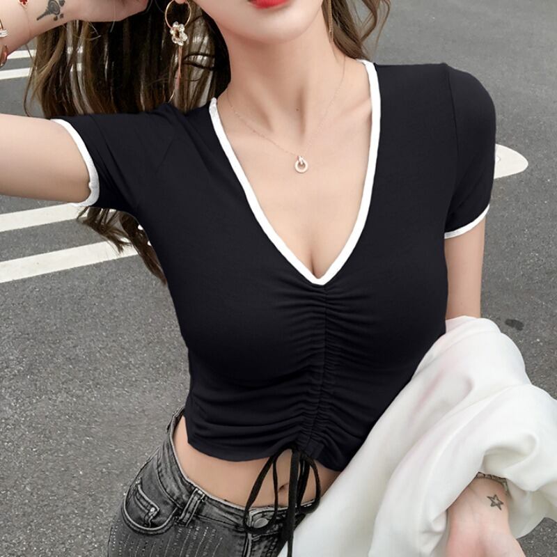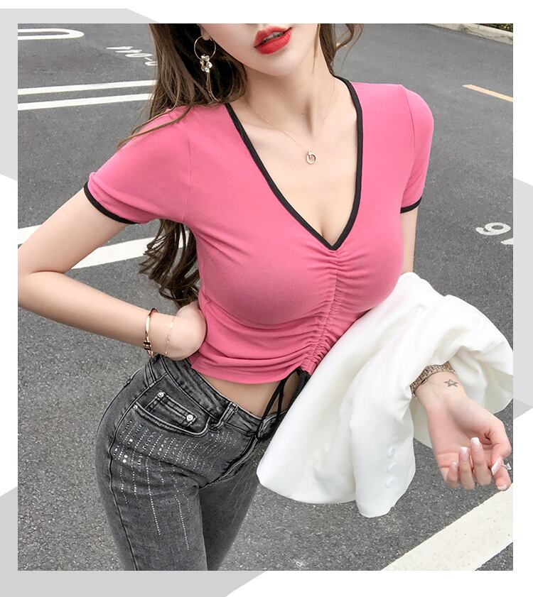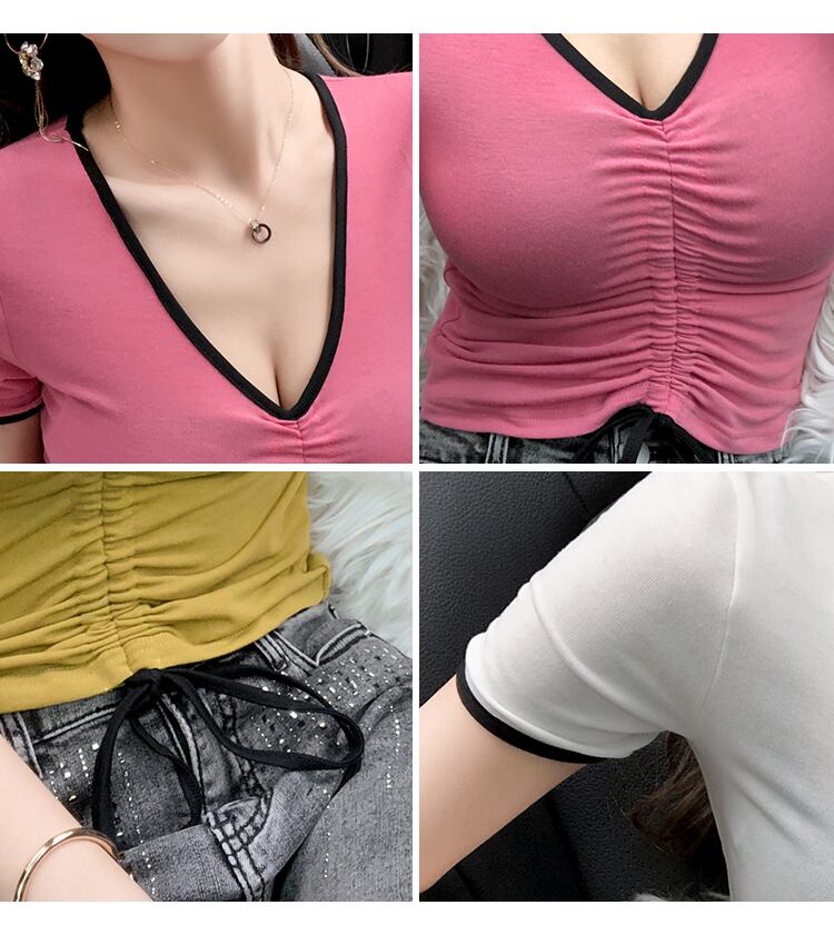 ショートブラウス サマーVネックスリムカラーTシャツ 夏物 ハンチェンe3086636692
