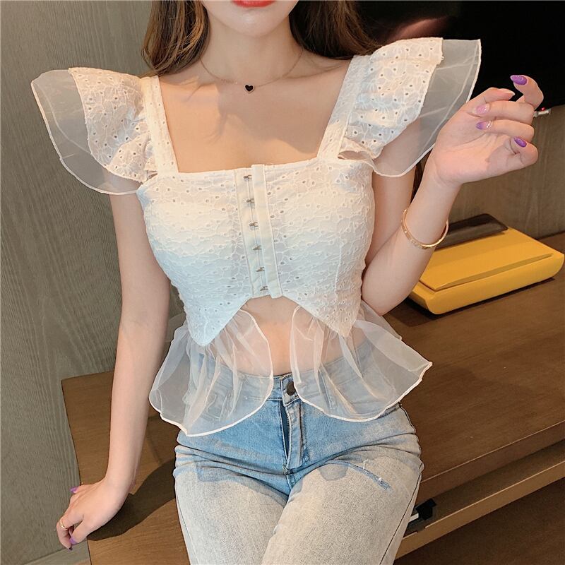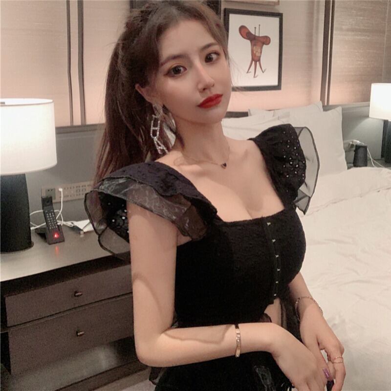 レースシャツ メッシュVネックホルターノースリーブトップス レッド ハンチェンe6916117861