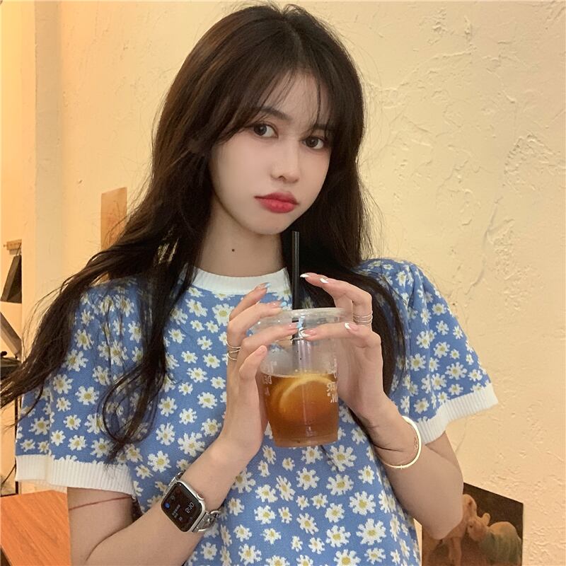 サマースタイルラウンドネックスリーブルーズ薄手ニットトップス レディース 夏物 Oネック ハンチェンe25114353554