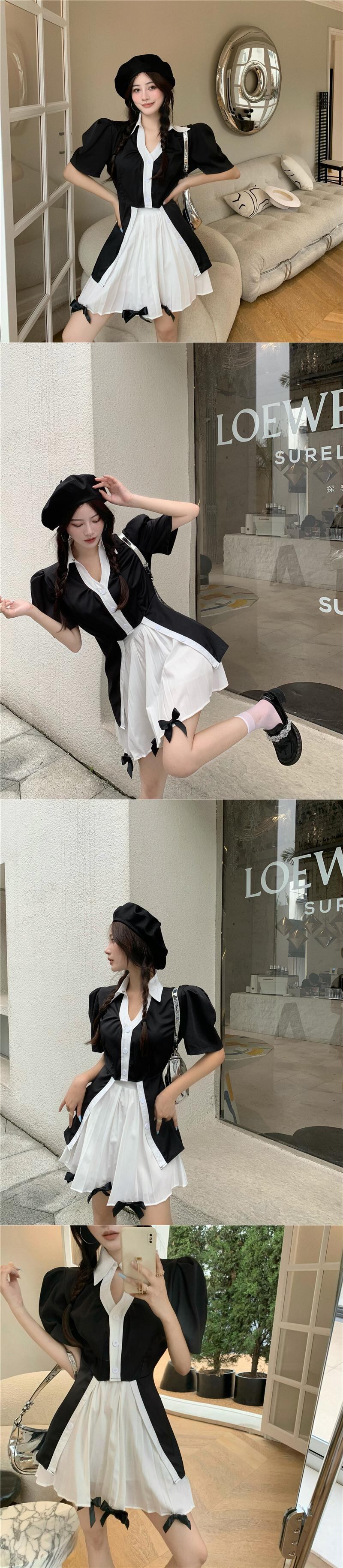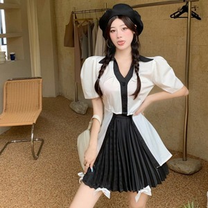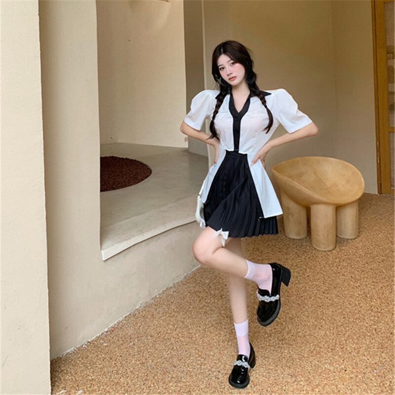スタイルサマースタンダードシャツ リボンプリーツスカート レトロ 夏物 ハンチェンe94342037890