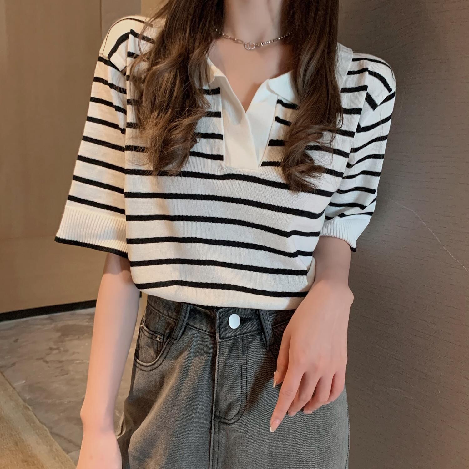 サマースタイルショートルーズ薄手ストライププルオーバー ニットトップス レディース 夏物 ハンチェンe75685473185