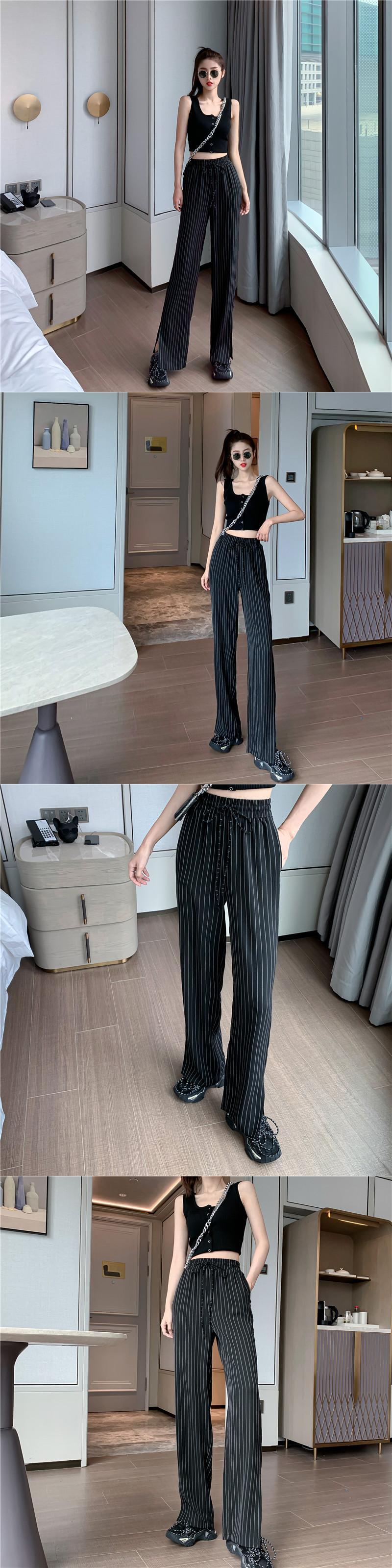 サマースタイルスタンダードストライプハイウェストウェストルーズワイドレッグカジュアルレディース レトロ 夏物 ワイドパンツ ハンチェンe38332004339