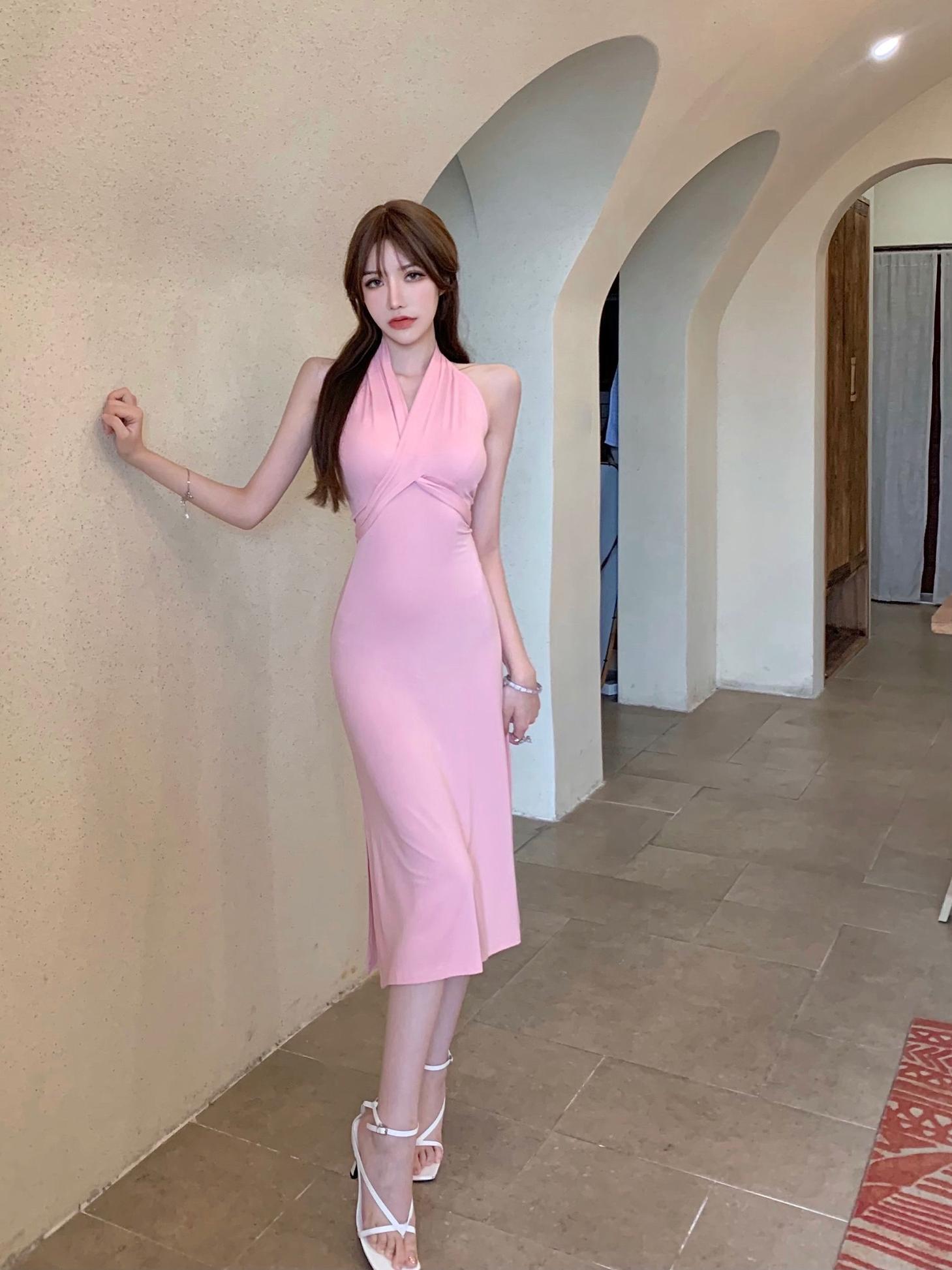 サマースタンダードスリムバックレスドレス レトロ エレガント 夏物 ハンチェンe12559347008