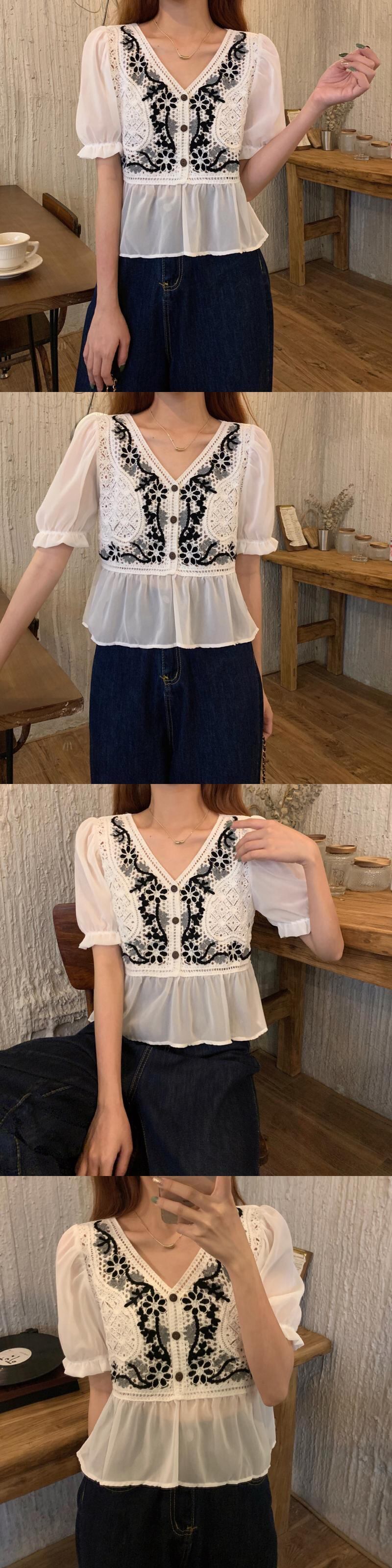 サマースタイルVネックウェストニットトップス レディース レッド 刺繍 夏物 ステッチ ハンチェンe64670699342