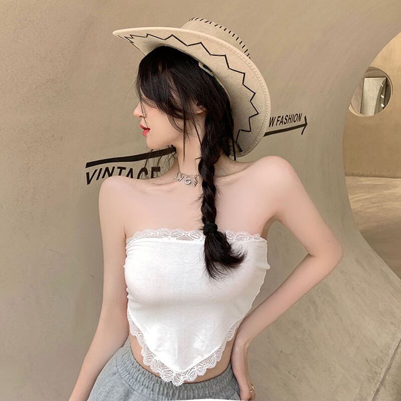 レーストライアングルスカーフ トップス レディースサマースリムショート 夏物 ステッチ ハンチェンe81706676861