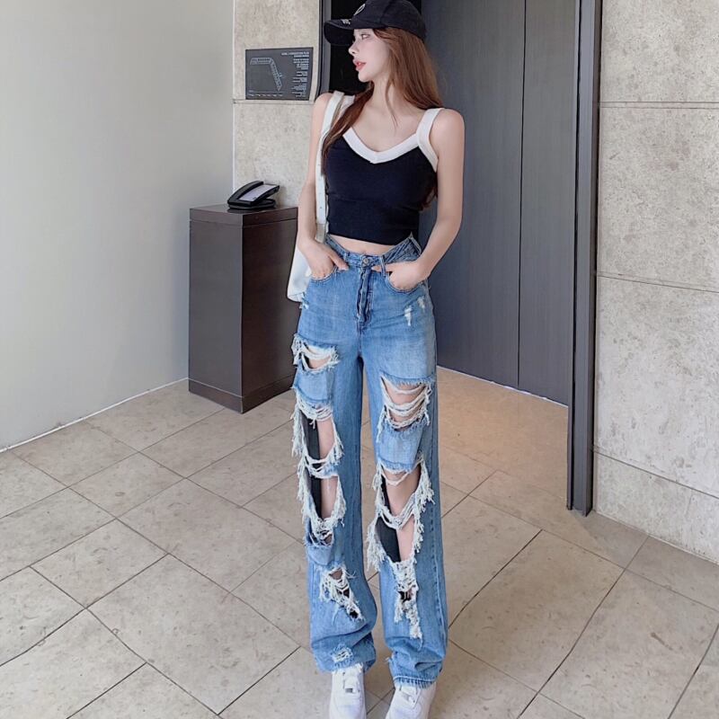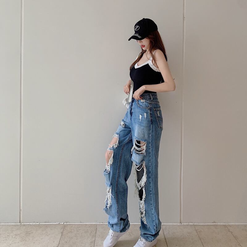 ジーンズ サマーハイウェストウェストスリムルーズワイドレッグパンツ 夏物 ワイドパンツ ハンチェンe5803686069