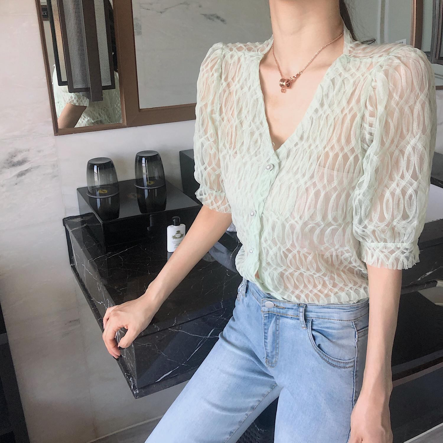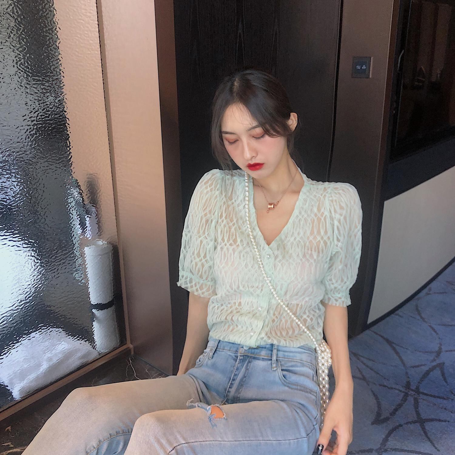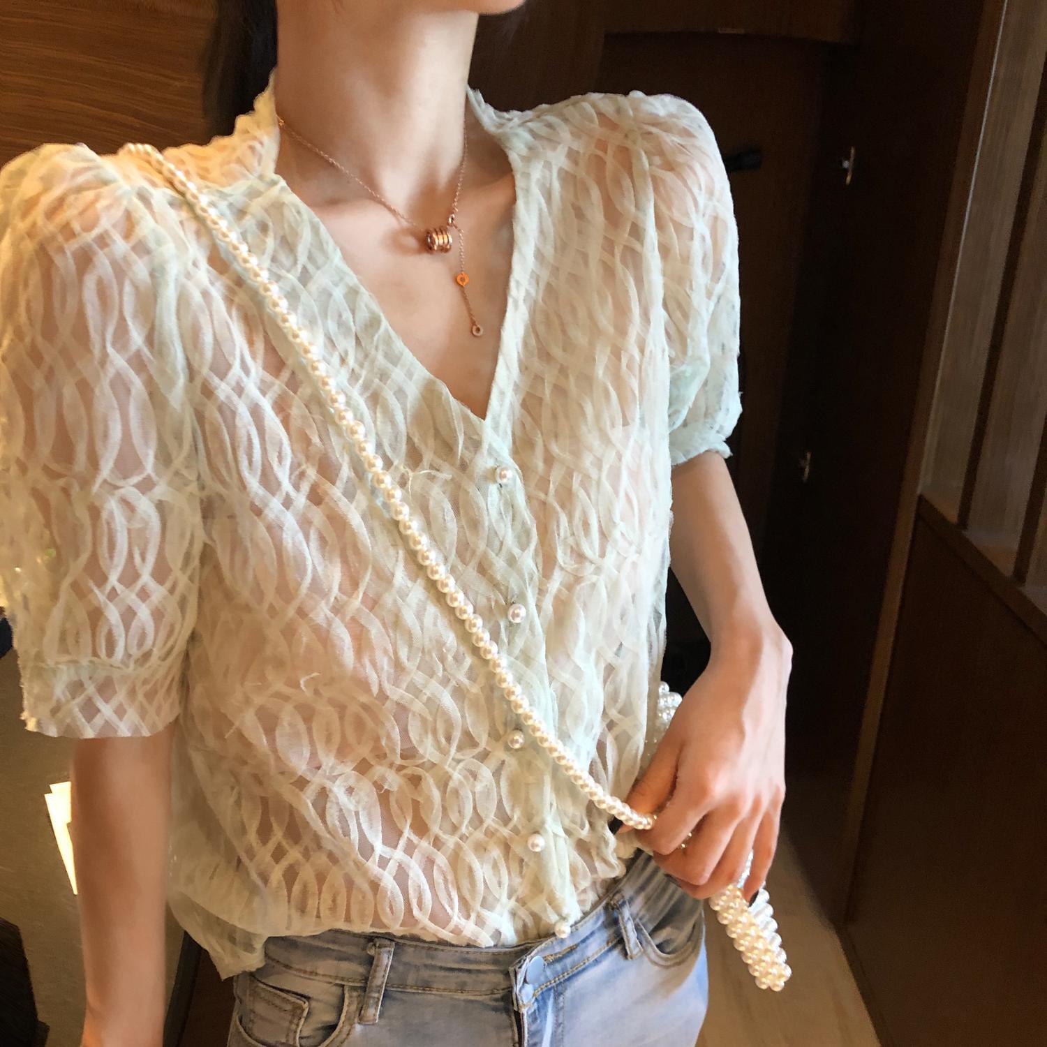 サマーVネックシフォントップス 夏物 ハンチェンe47462356922