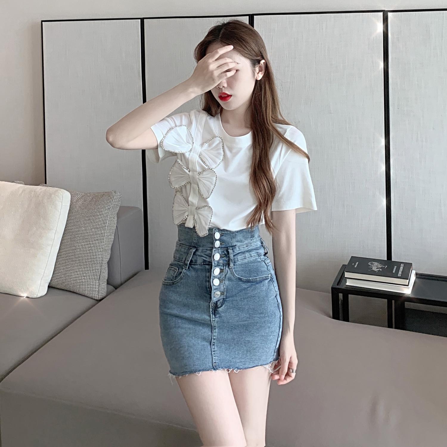 サマースタイルラウンドネック半袖スリーブスリムリボンブラウス レディース ショート ハーフスリーブ 夏物 Oネック ハンチェンe68035736516