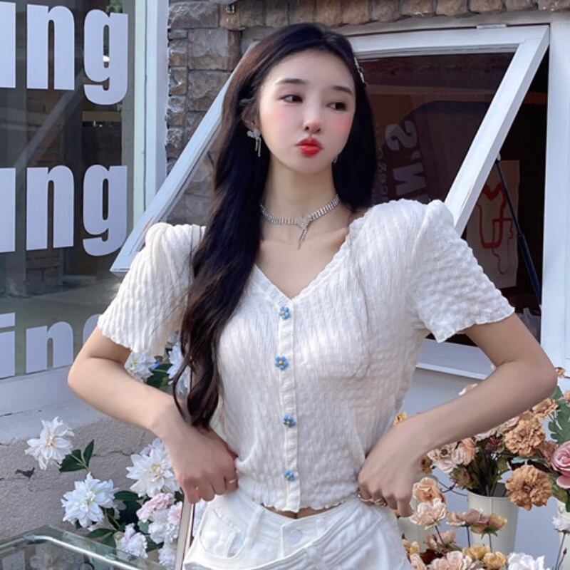 ショートブラウス サマーVネックスリム薄手Tシャツ 夏物 ハンチェンe63397727817