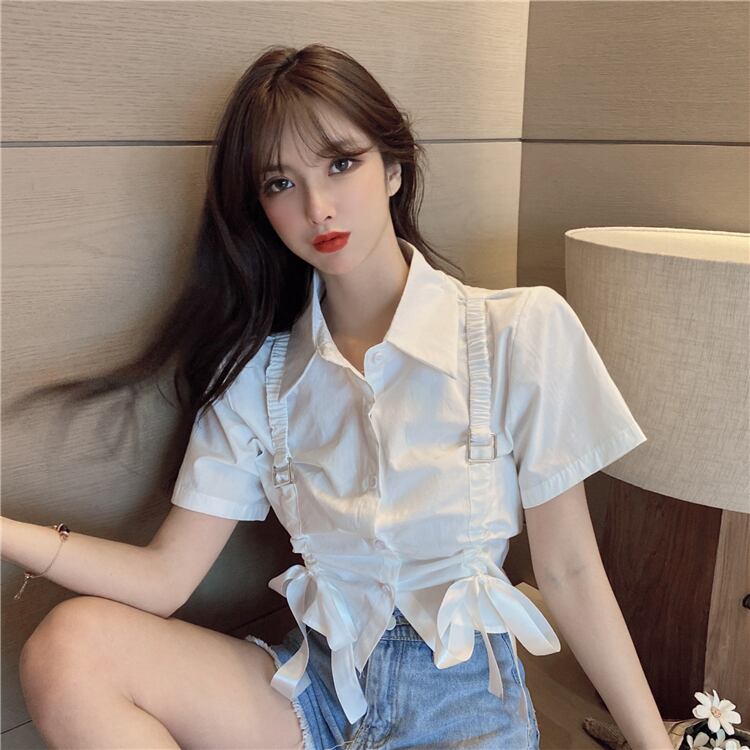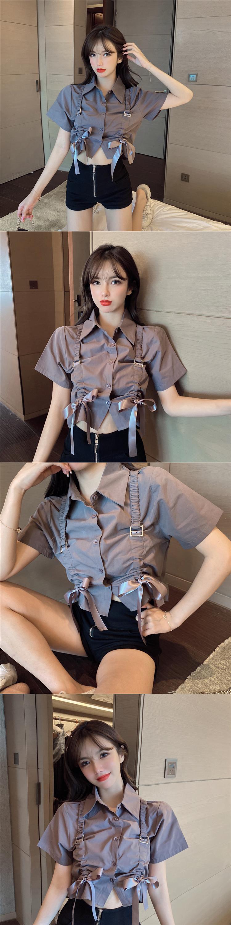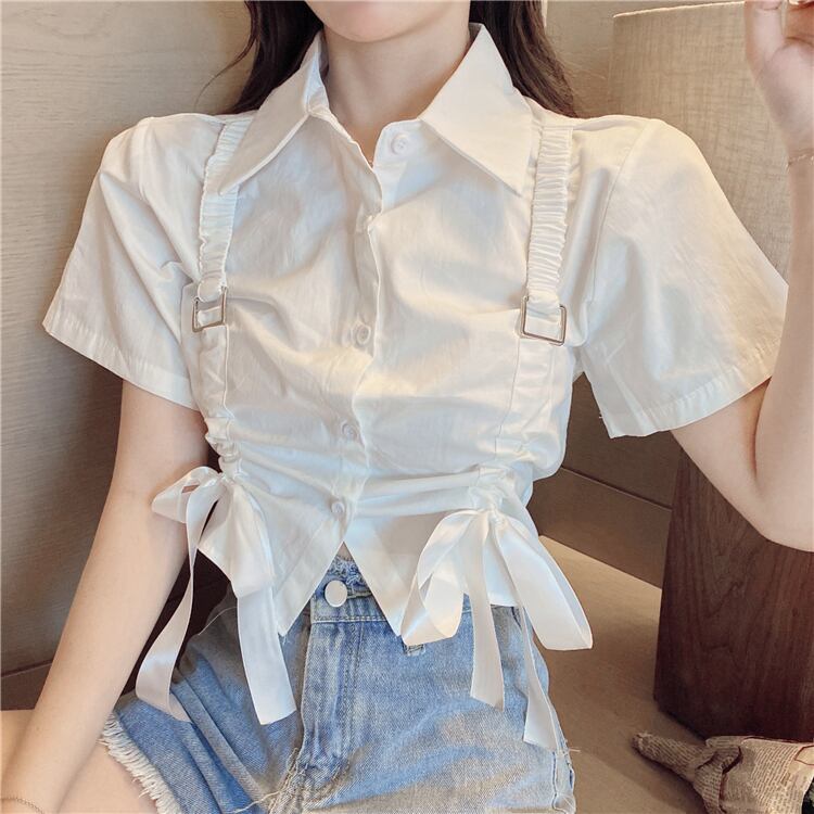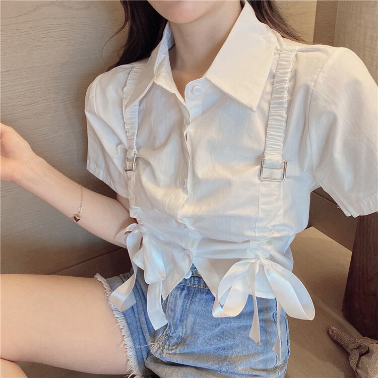 サマースタイルショートソリッド カラーギャザー半袖スリーブシャツ トップス レディース ハーフスリーブ 夏物 ソリッドカラー ハンチェンe13333647676