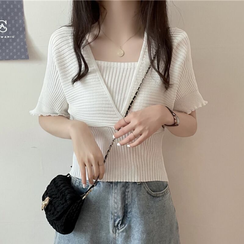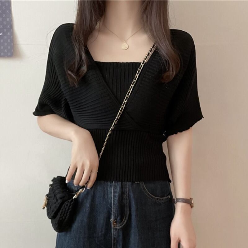 サマースタイル半袖スリーブスリムプルオーバー ニットトップス レディース ショート ハーフスリーブ 夏物 スクウェア ハンチェンe79821564517
