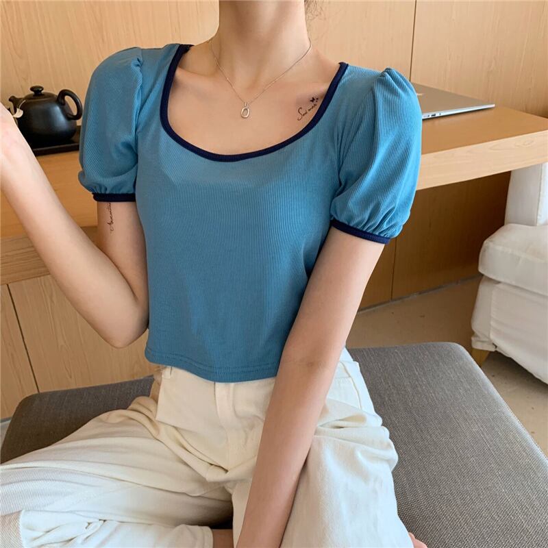 ショートブラウス サマーレッドカラーTシャツ 夏物 スクウェア ハンチェンe83010657205