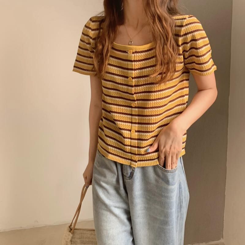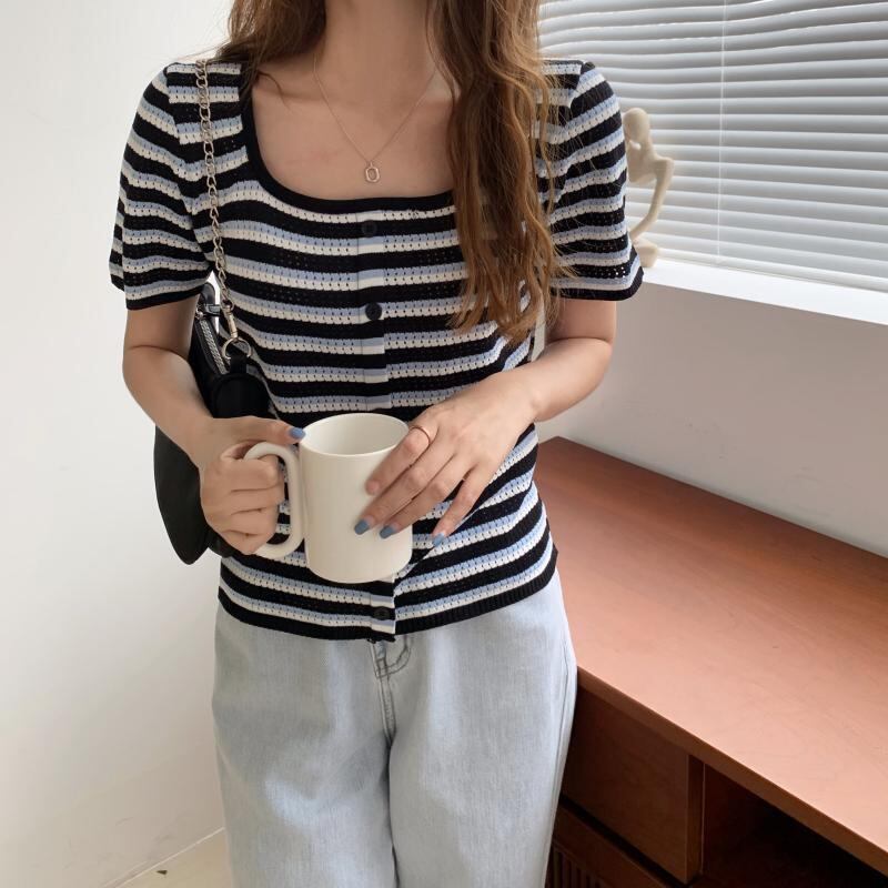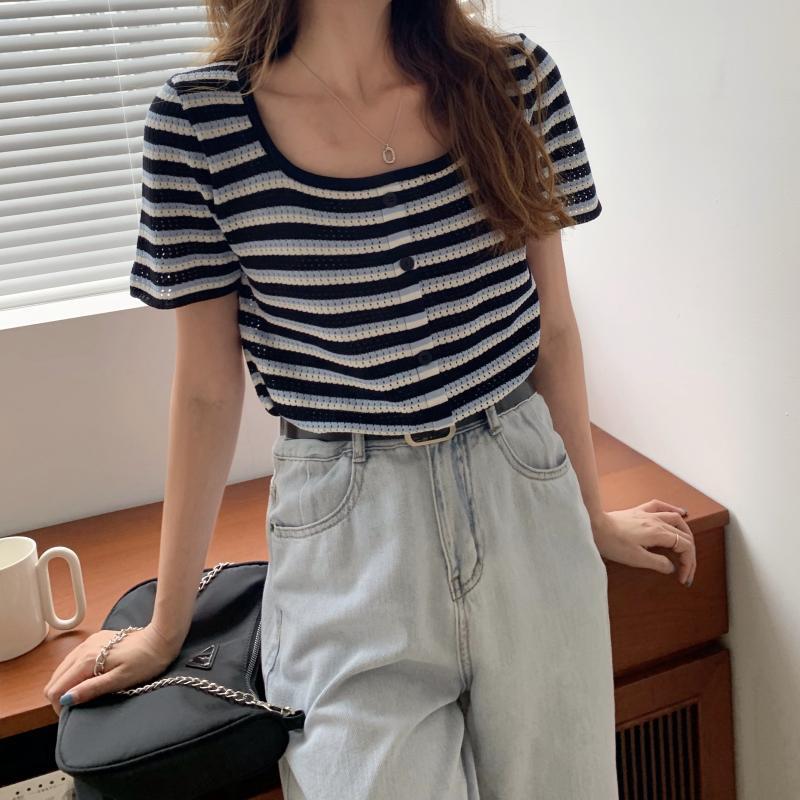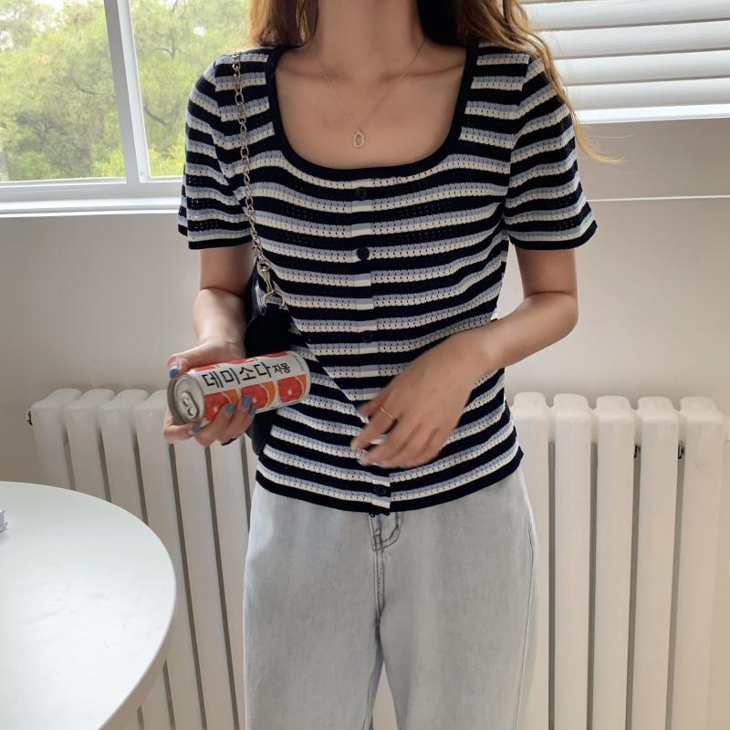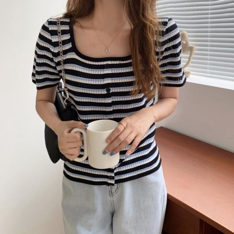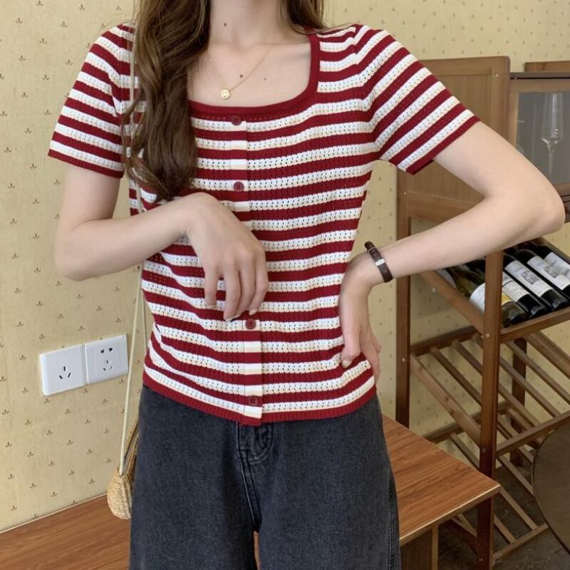 サマーショートスリムストライプニットトップス レディース 夏物 ハンチェンe93459600753
