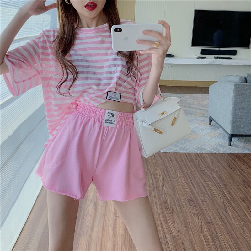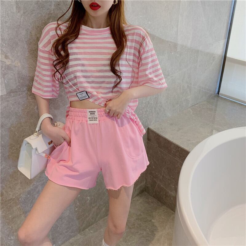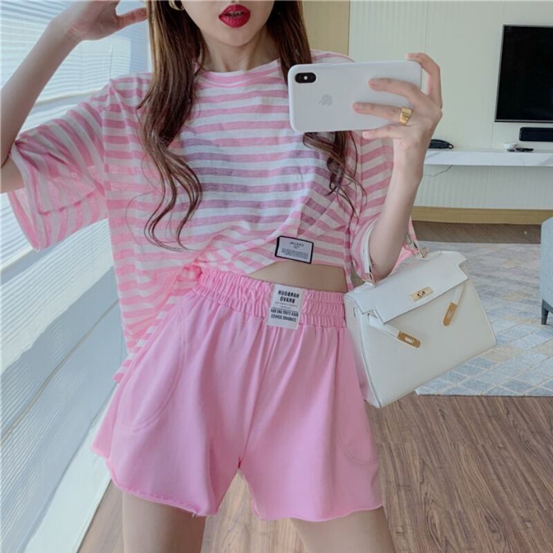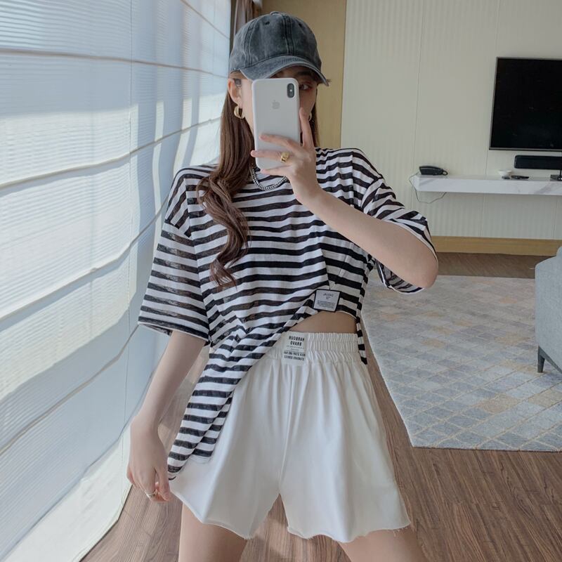 サマーストライプTシャツ トップス ハイウェストウェストワイドレッグショーツ 夏物 ブルマー ワイドパンツ ハンチェンe62161596742