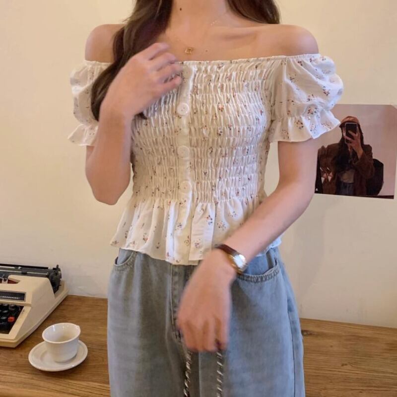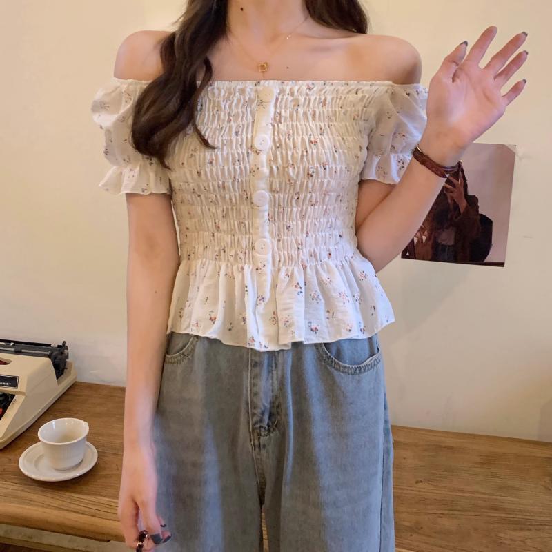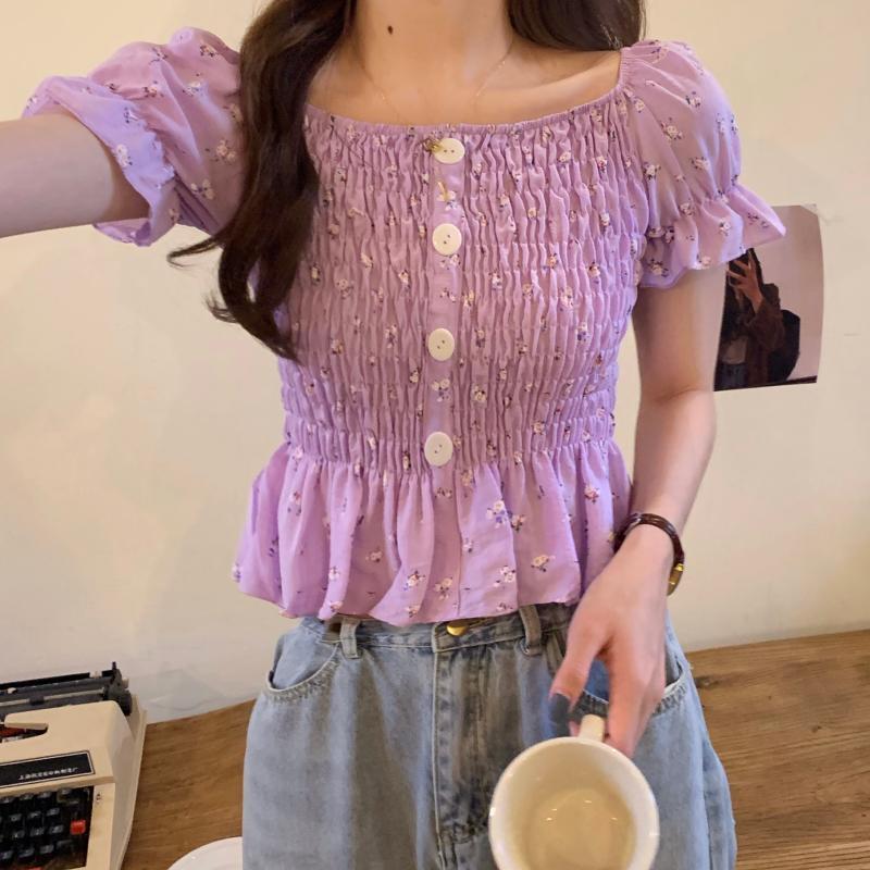 フローラルシャツ サマースタイルスリーブウェストクロップドトップス 夏物 花柄 ハンチェンe86844746543
