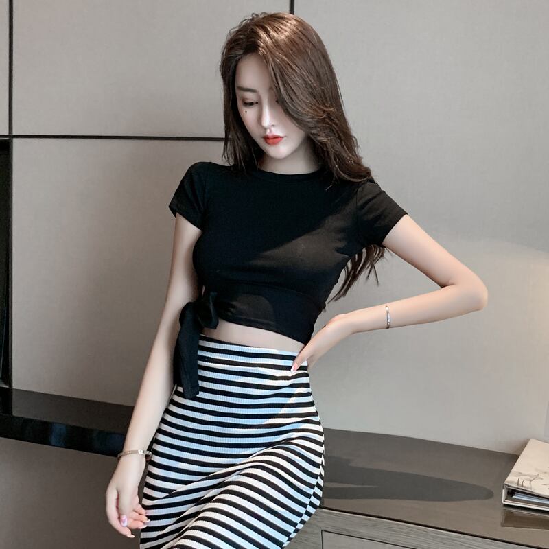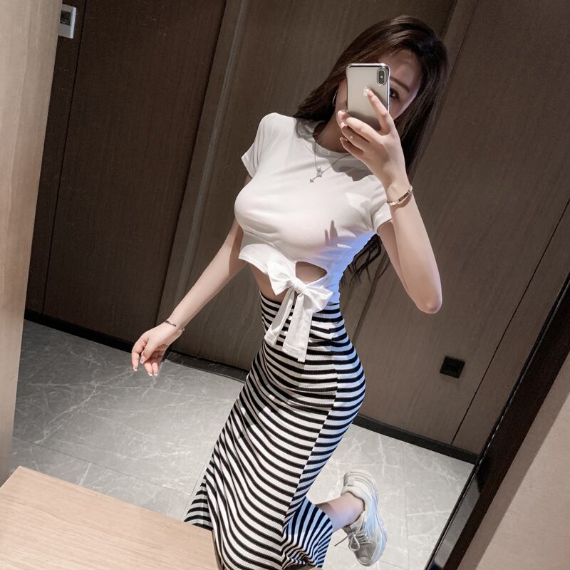 サマーリボンショートトップス ストライプスカート 夏物 ハンチェンe97118989714