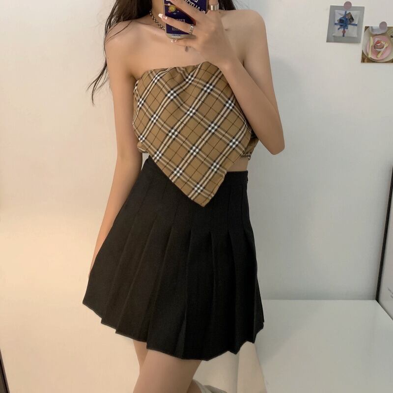 スタイルサマー格子柄トライアングルスカーフ トップス プリーツハイウェストウェストスカート 夏物 ハンチェンe61929055102
