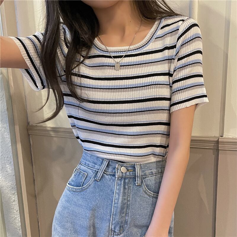サマーラウンドネック薄手ストライプTシャツ レディース 夏物 Oネック ハンチェンe29243110747