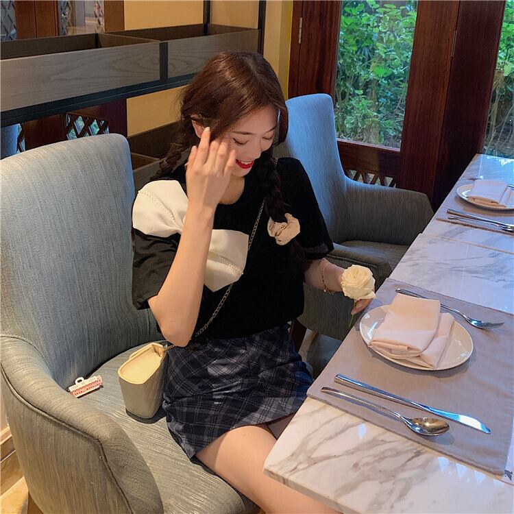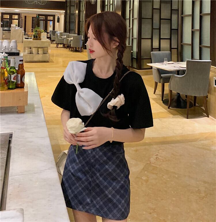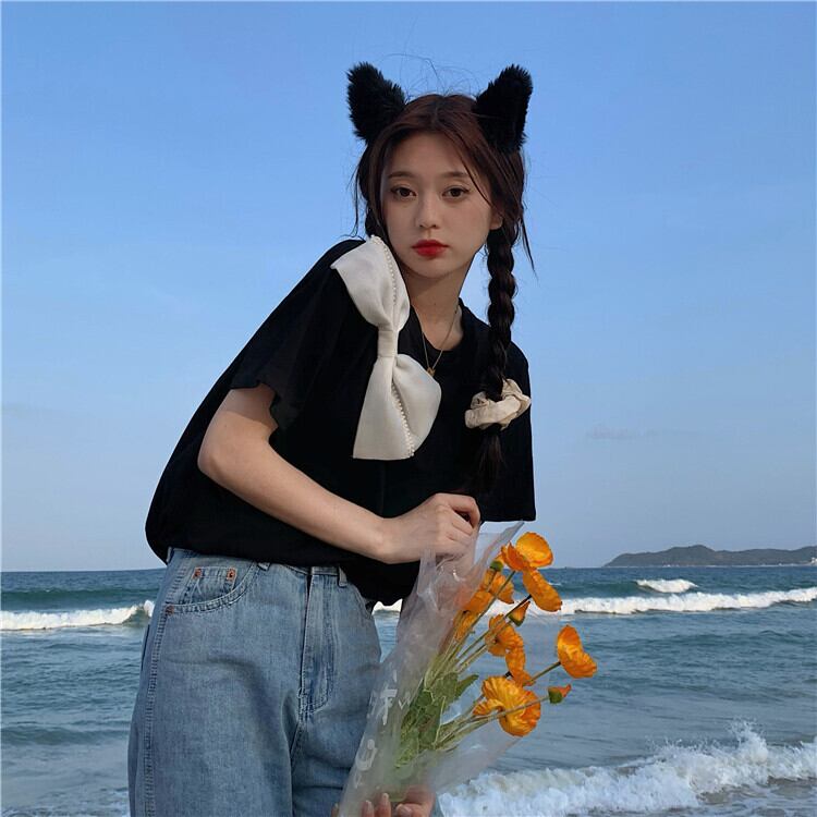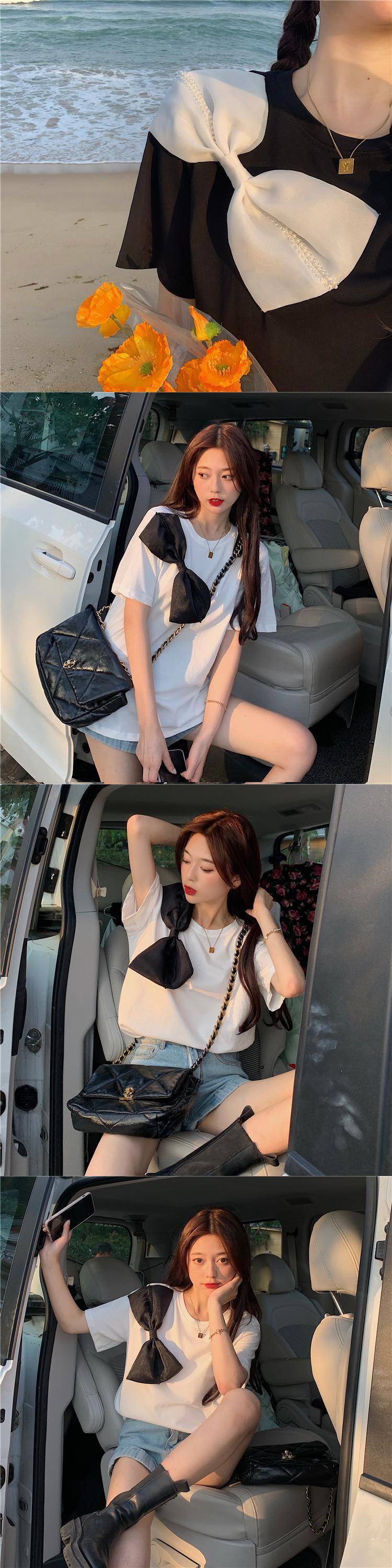 サマーメッシュリボンラウンドネックTシャツ トップス 大人ガーリー スウィート キュート カジュアル 夏物 Oネック ハンチェンe54998840175