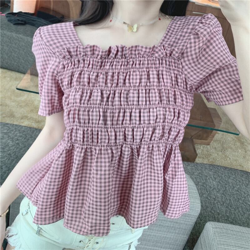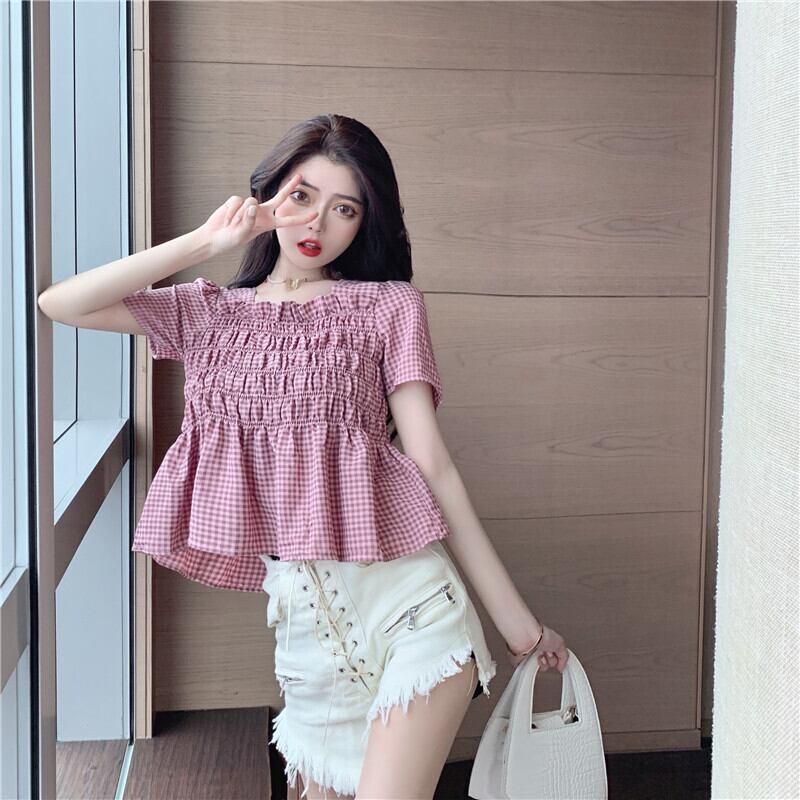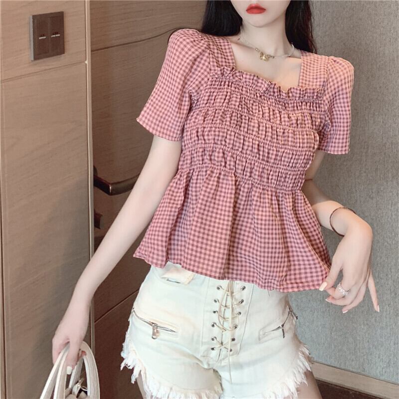 格子柄シャツ レディースサマースタイルスタンダードカラー半袖スリーブスリムブラウス ショート レトロ ハーフスリーブ 夏物 スクウェア ハンチェンe56080991441