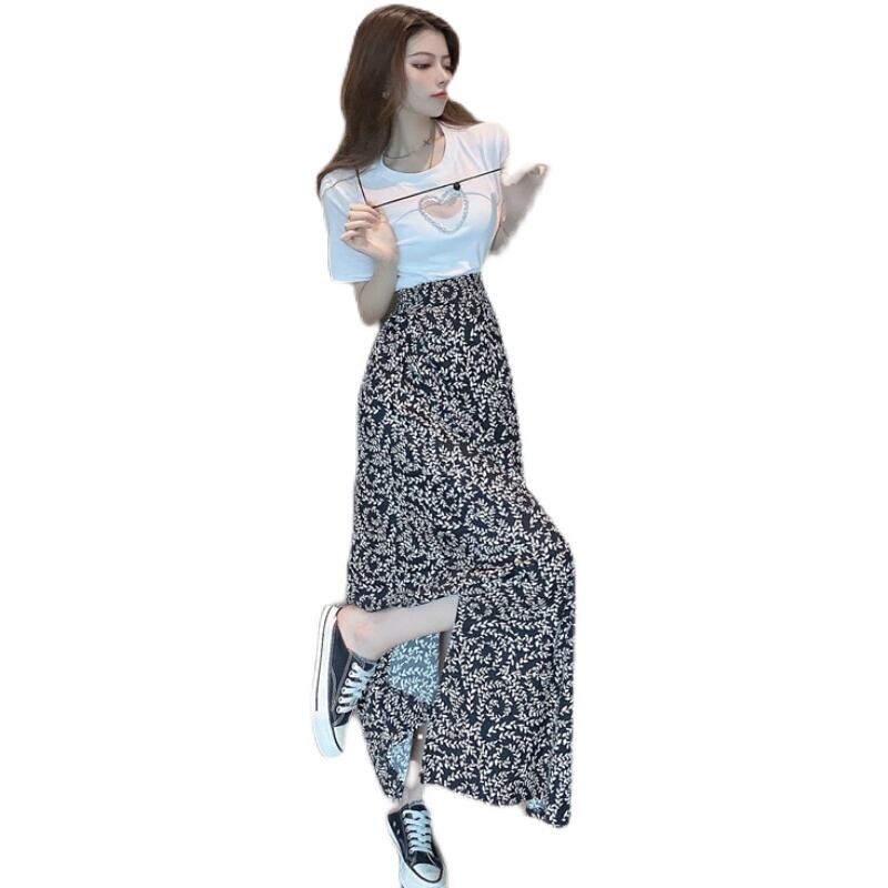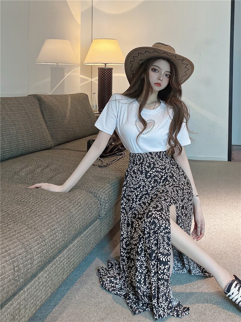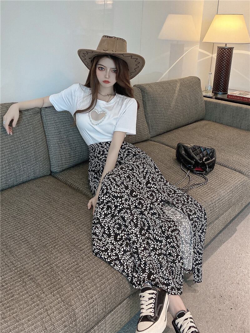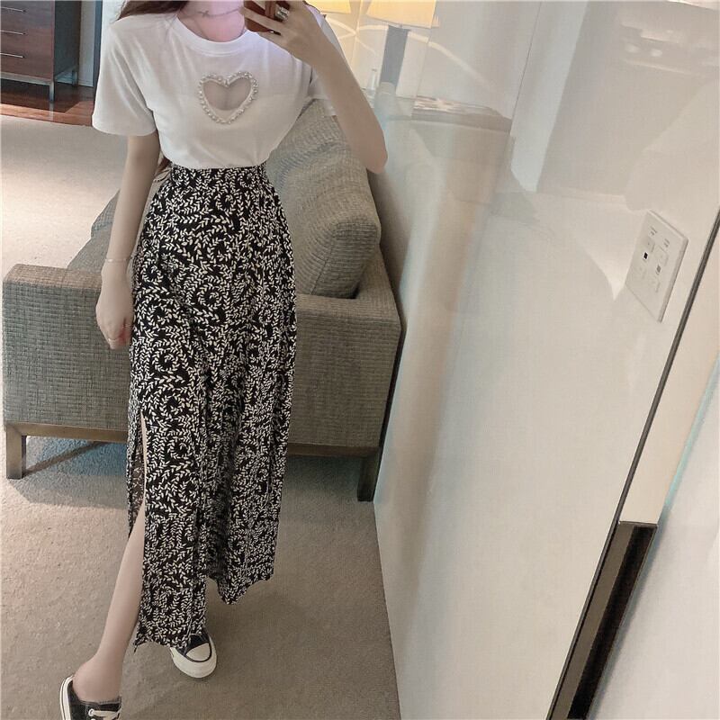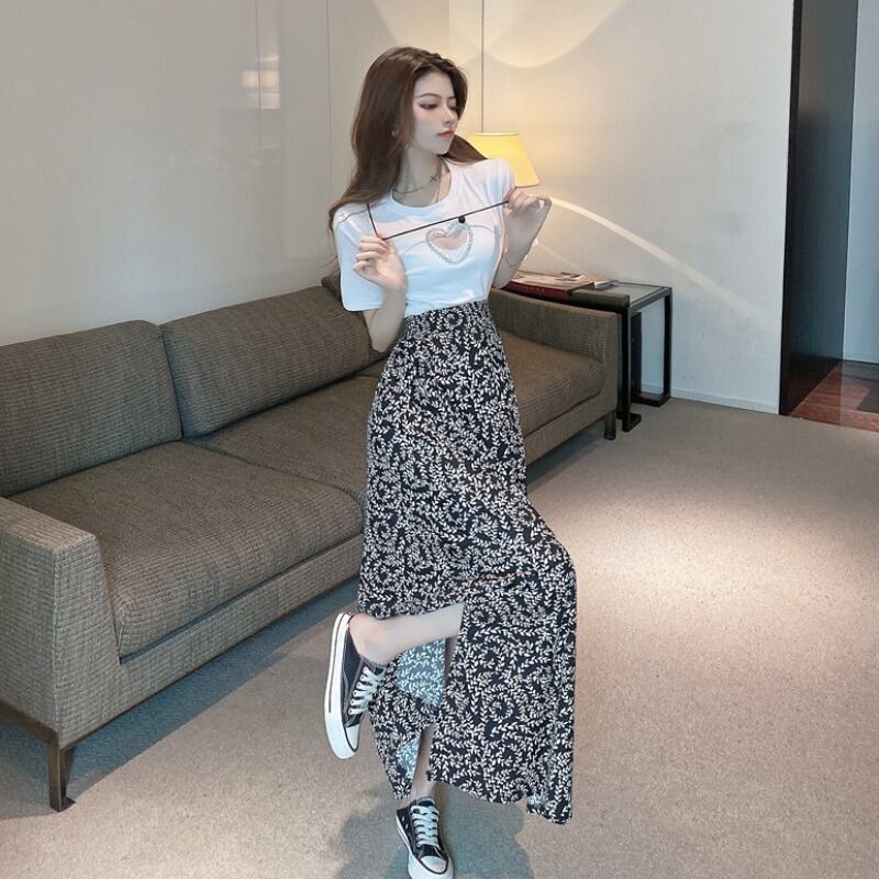 スカート サマーハイウェストウェストプリントロング 夏物 ハンチェンe83647279874
