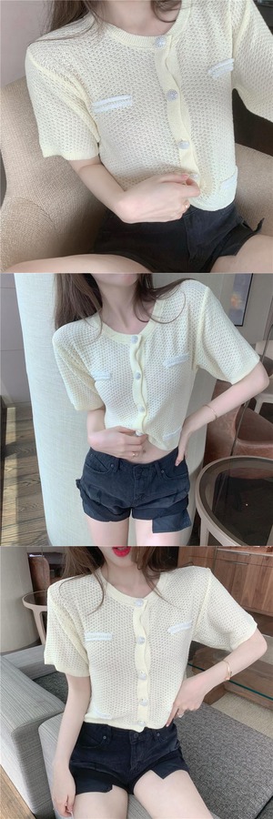 サマースタイルラウンドネック半袖スリーブスリムニットカーディガンジャケット レディース ショート ハーフスリーブ 夏物 Oネック ハンチェンe72406174924