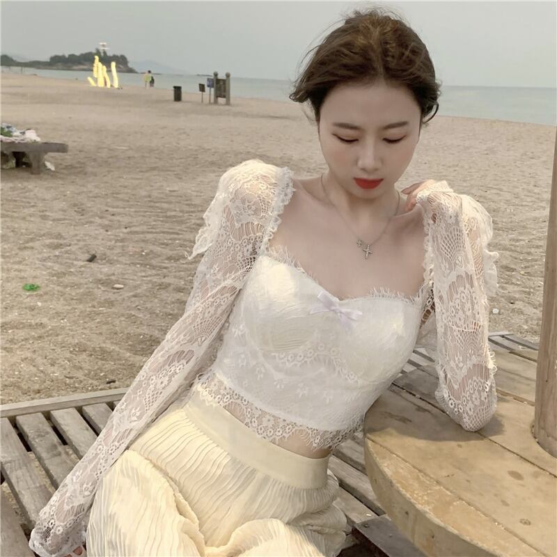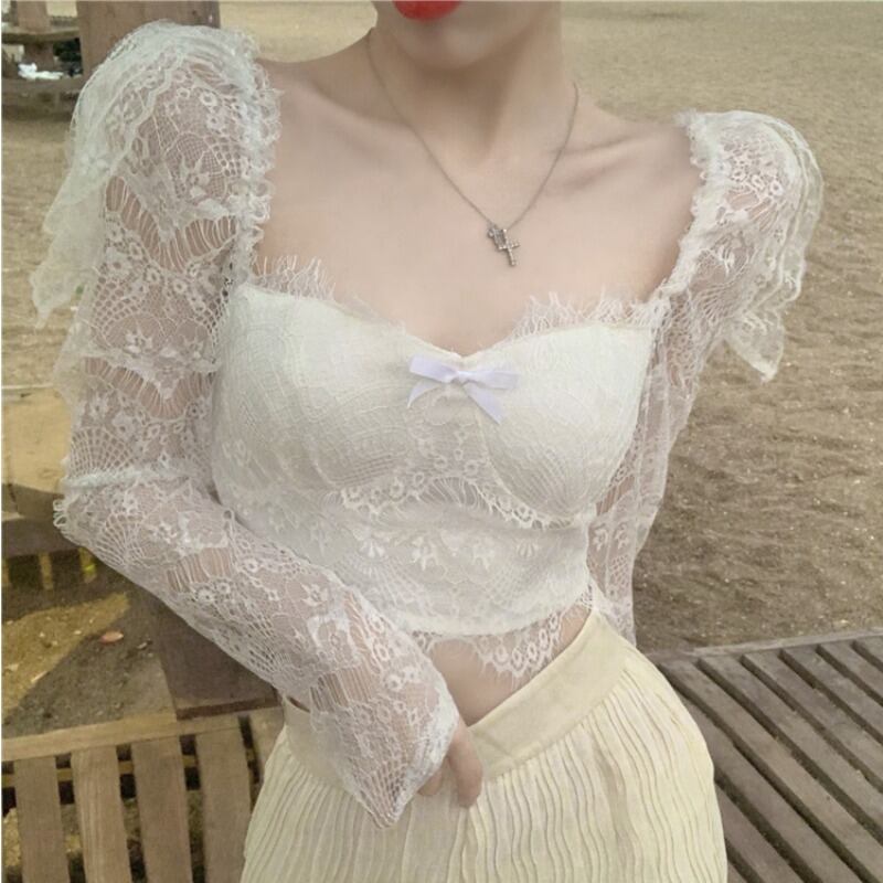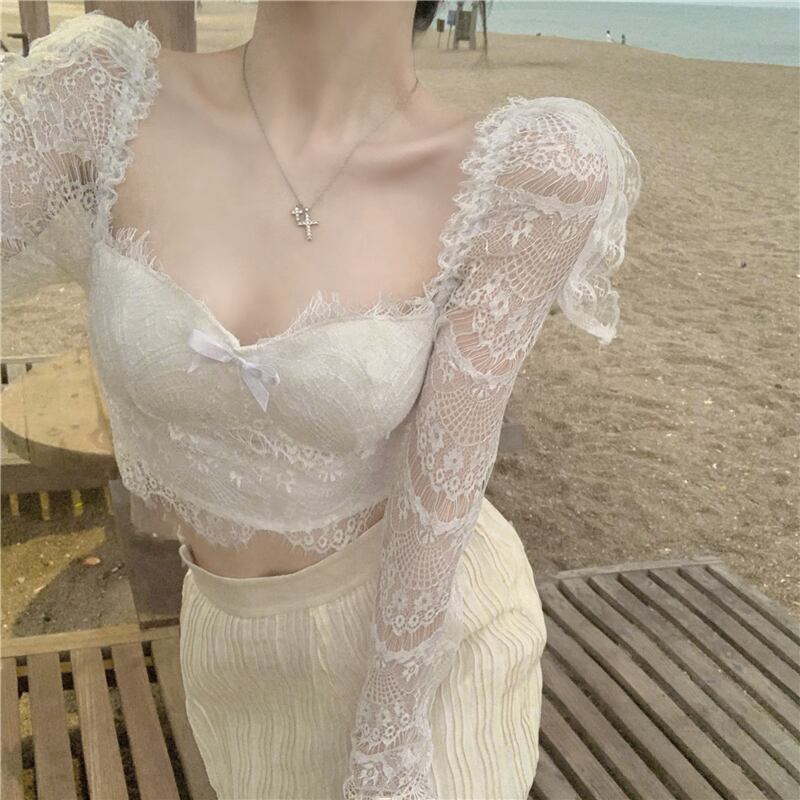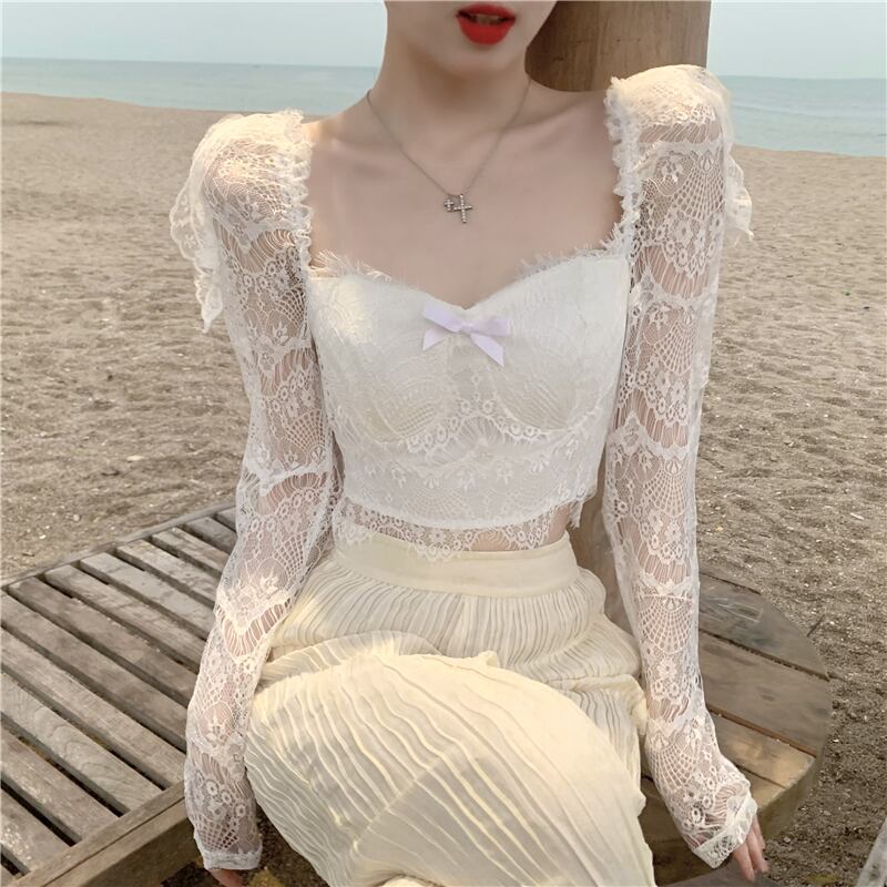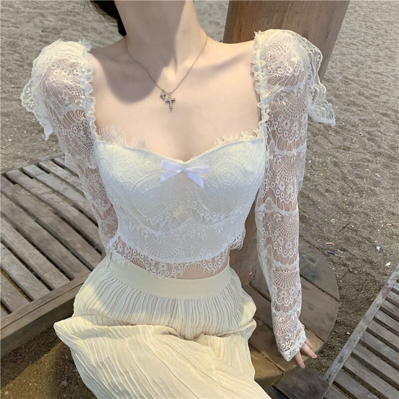 サマースタイルレースシャツ リボンショートトップス レディース ロング 夏物 ピュア ハンチェンe44978917181