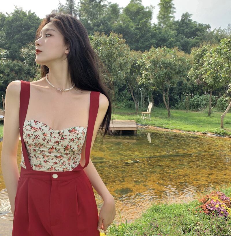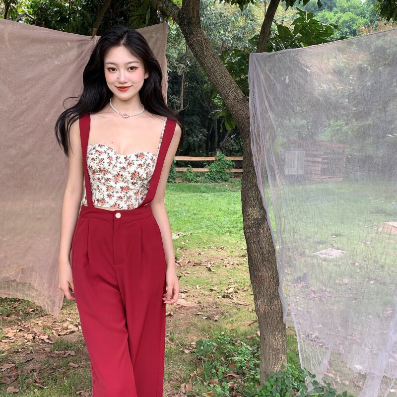 サマーフローラルトップス ハイウェストウェスト薄手ワイドレッグパンツ 夏物 花柄 ワイドパンツ ハンチェンe80687305756