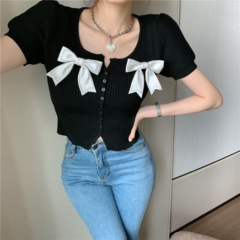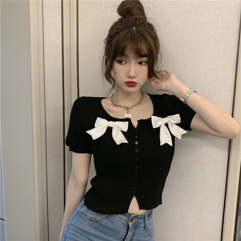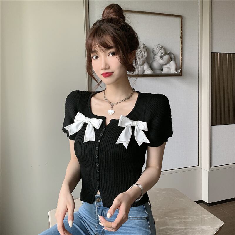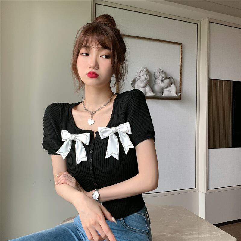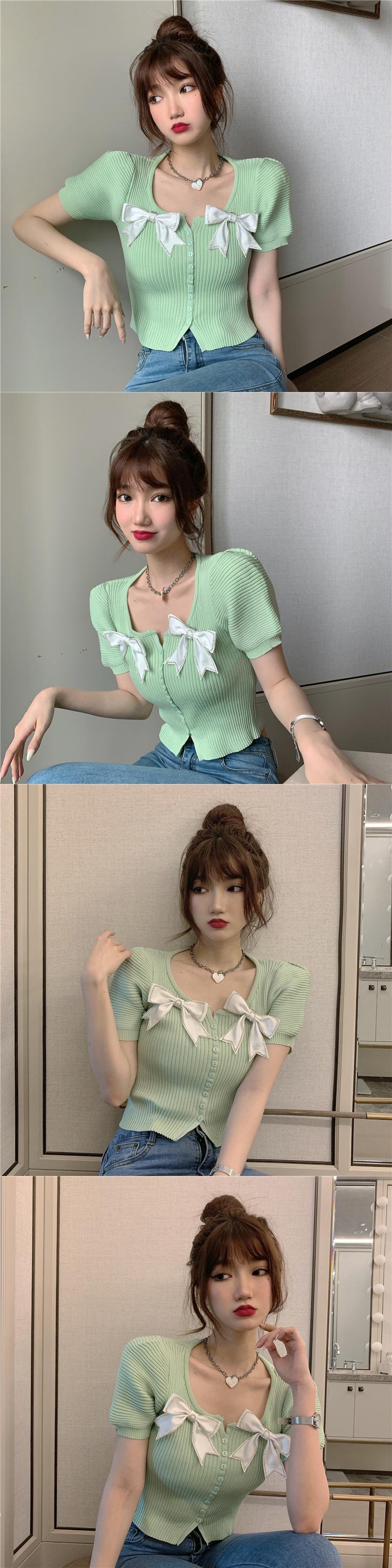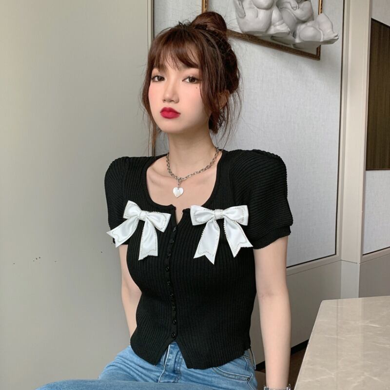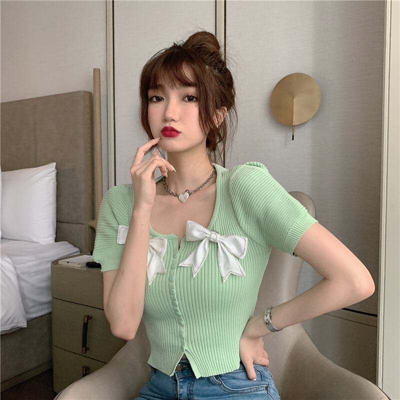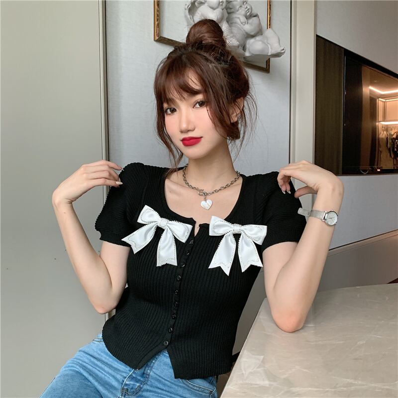 サマースタイルショートスリムリボンニットトップス 夏物 ハンチェンe86024892477