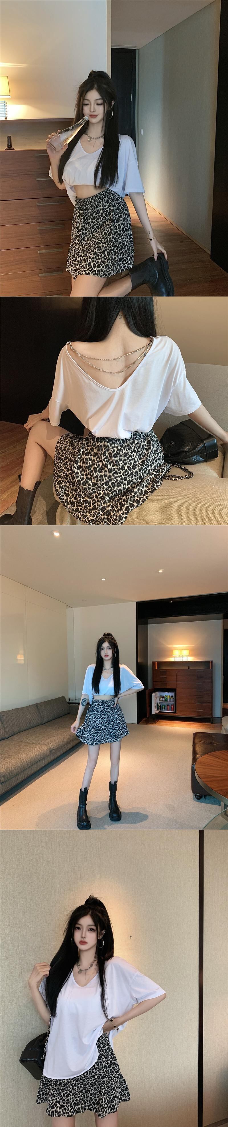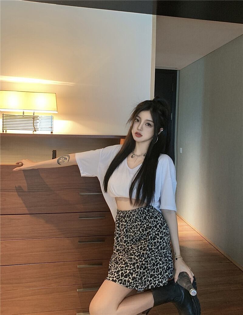 サマーソリッド カラーTシャツ ハイウェストウェストレオパードスカート ストリート 夏物 ソリッドカラー ハンチェンe97635279894