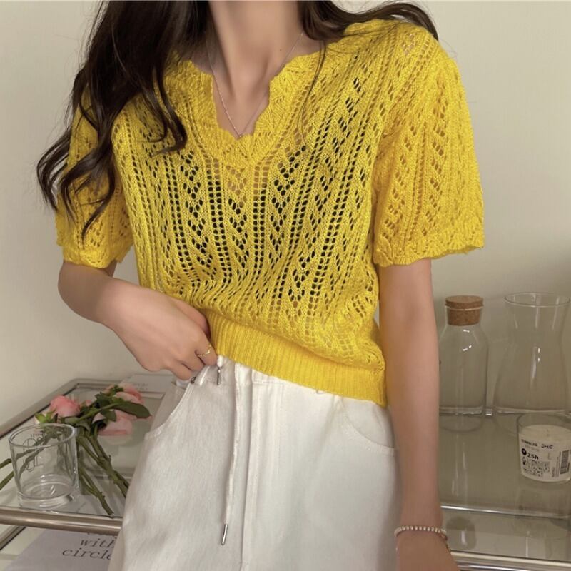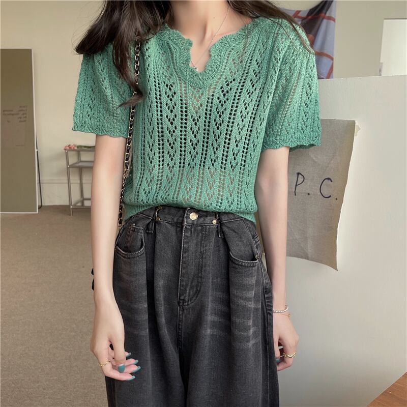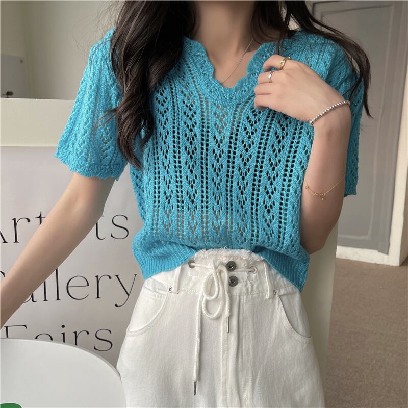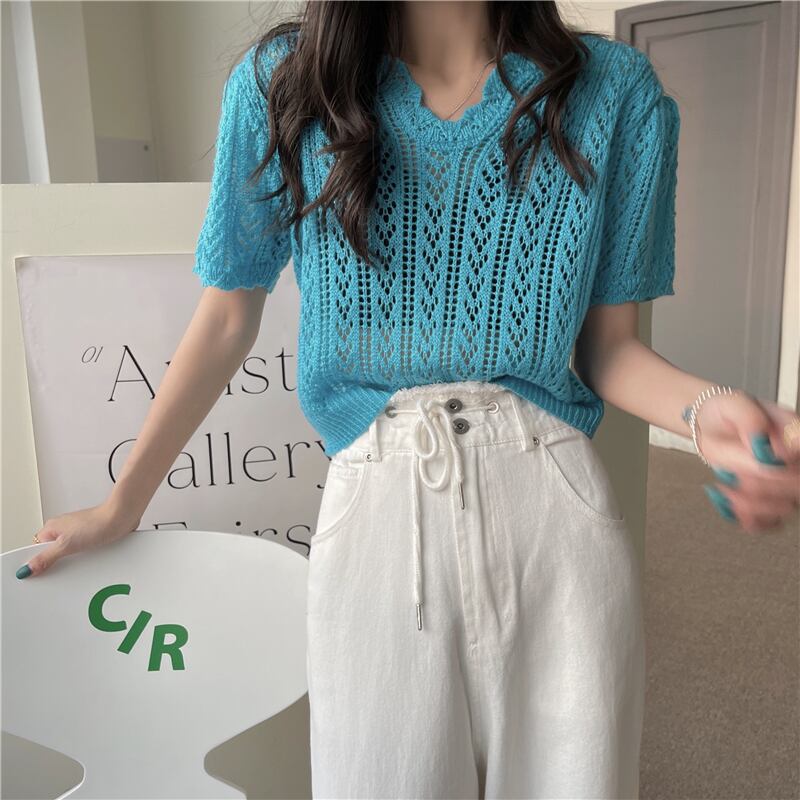 サマースタイルVネックルーズ薄手ニットトップス レディース 夏物 ハンチェンe94174210671