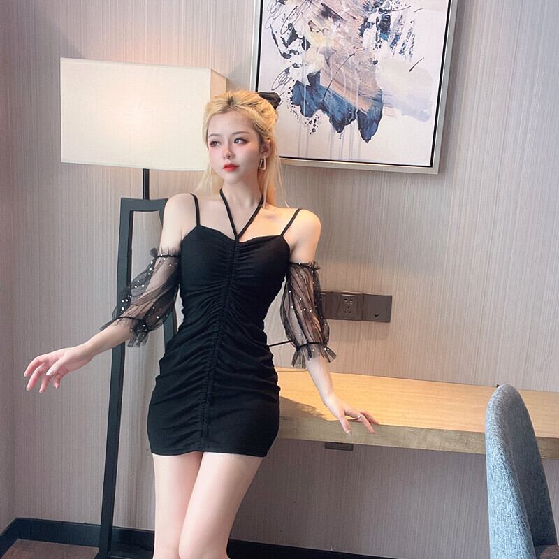 ブラックドレス ギャザープリーツストラップレス ハンチェンe36230080867