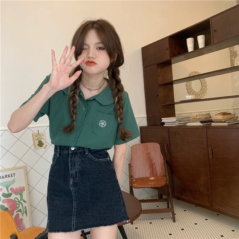 スタンダードカラーショートシャツ トップス レッド レトロ 刺繍 ピュア ハンチェンe48287300412