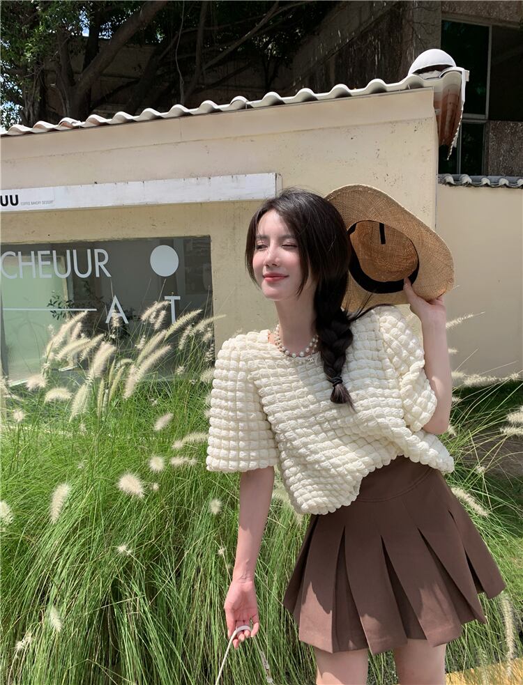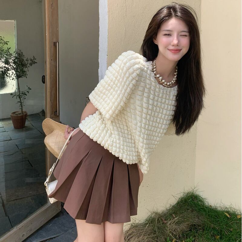 ラウンドネックスリーブシャツ ハイウェストウェストプリーツスカート レッド Oネック ハンチェンe75356135884
