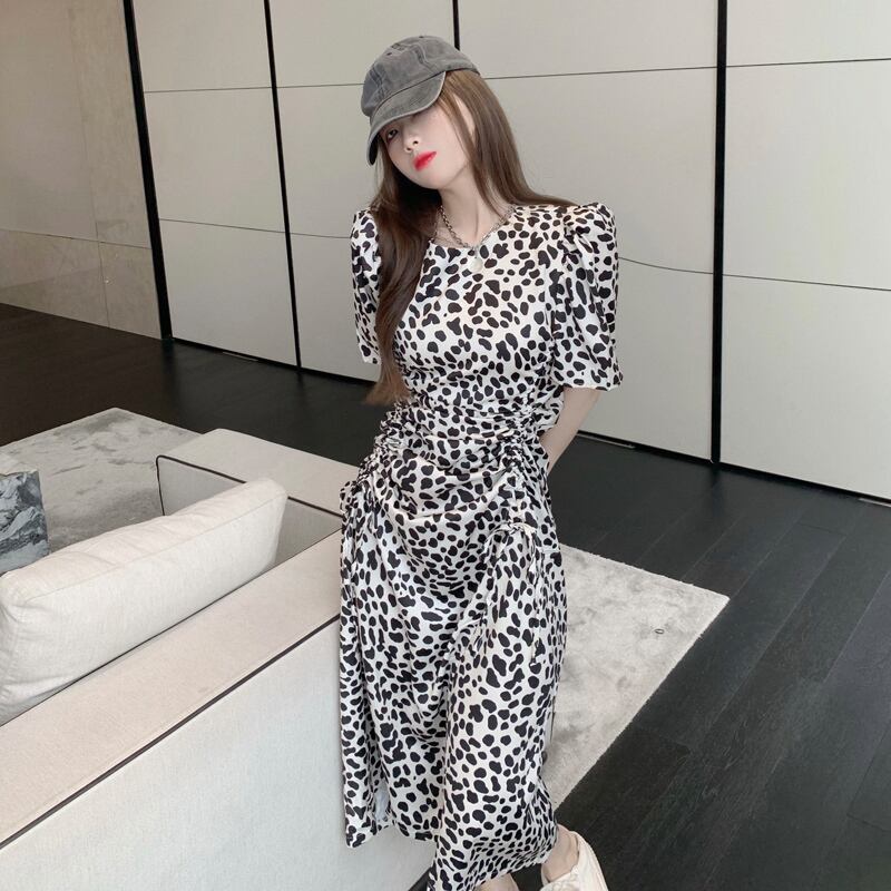 レオパードプリント柄スリーブドレス ラウンドネックスリム薄手Aライン Oネック ハンチェンe99529178325