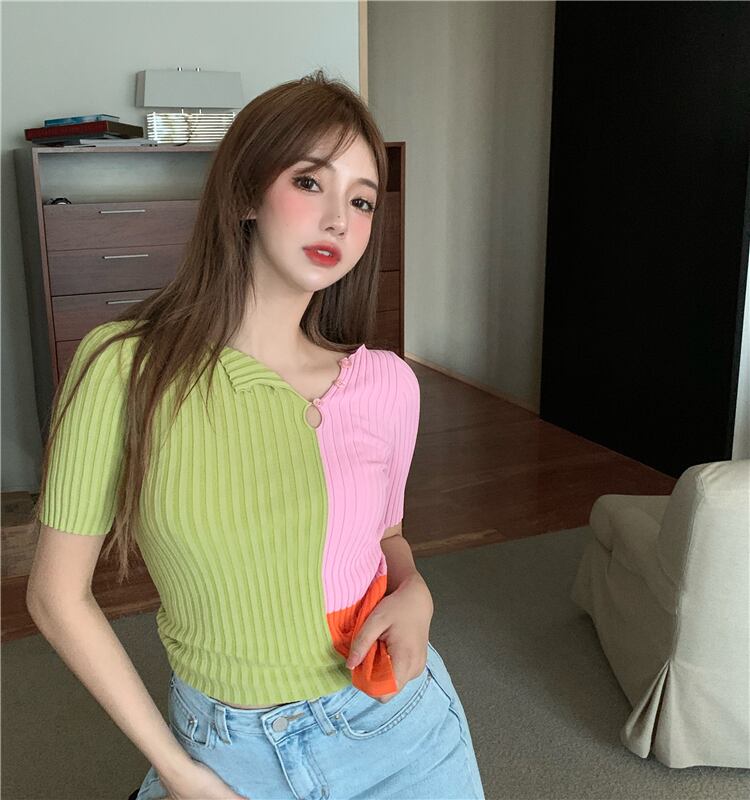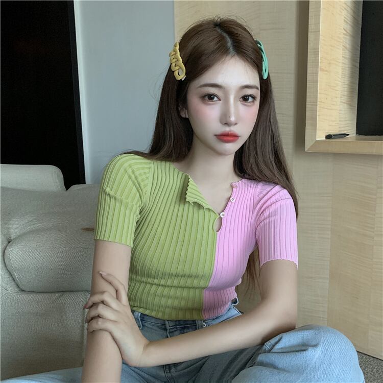 ニットショートスリムトップス レディース 半袖 ハーフスリーブ シルク ハンチェンe31127662076
