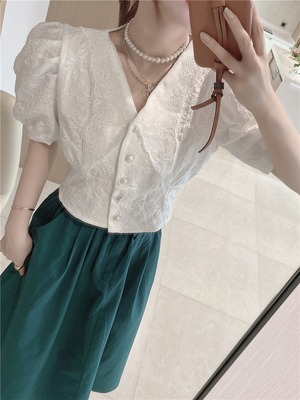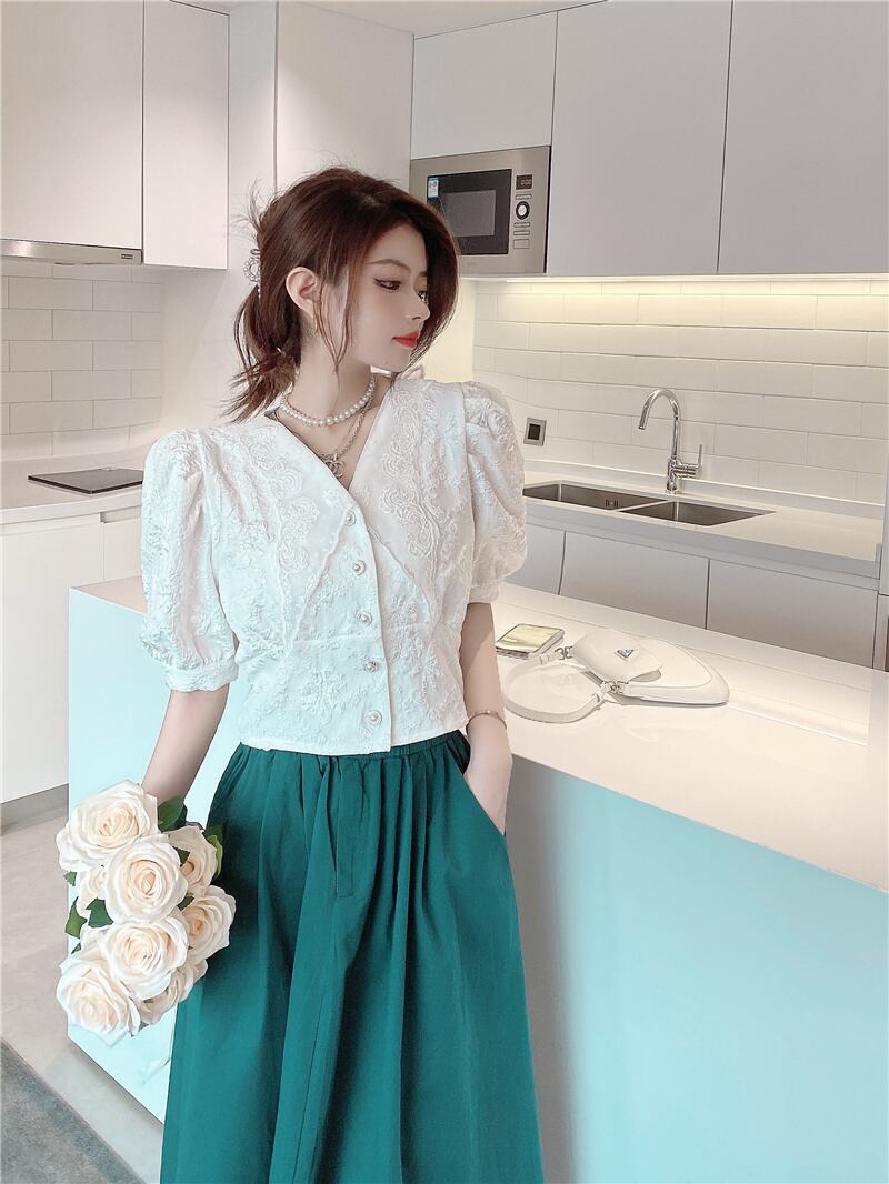 サマー刺繍レースシャツ ハイウェストウェストAラインスカート 夏物 ハンチェンe10533942411