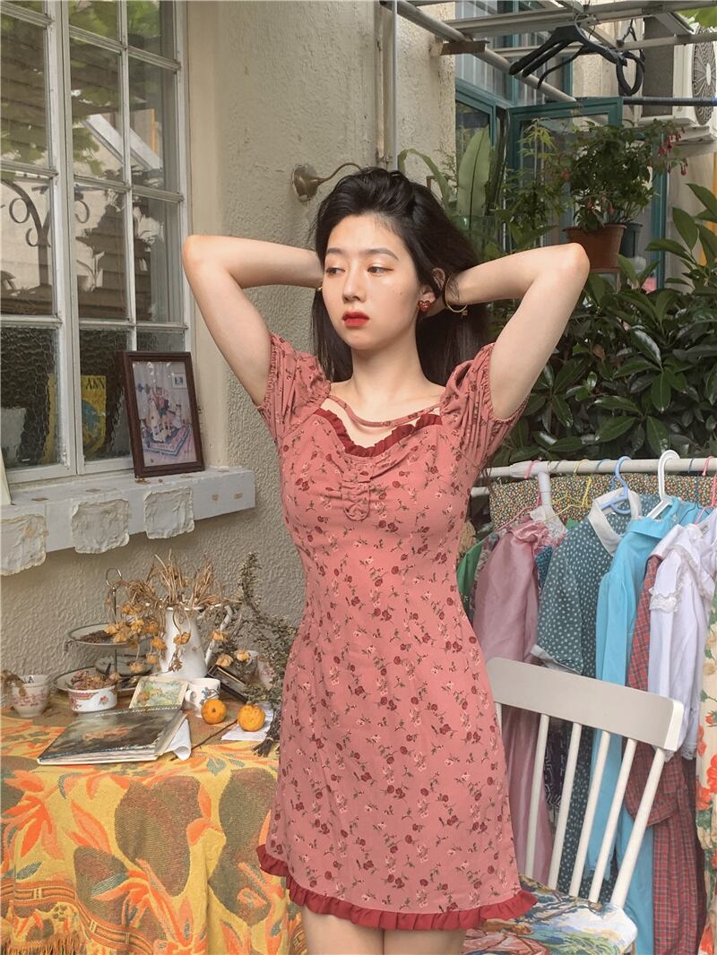 フローラルスタンダードショートスカート サマースタイルスリーブウェストプリントドレス レトロ 夏物 花柄 スクウェア ハンチェンe91309873280