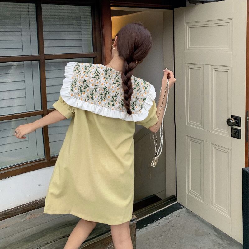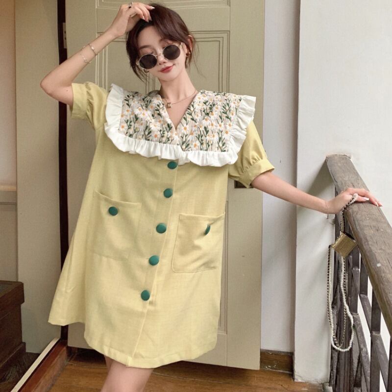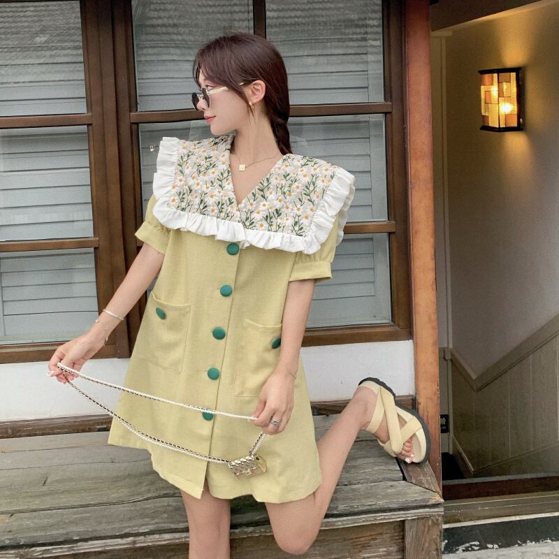 レースドレス ネイビーカラーショートフローラルルーズカジュアルAラインスカート レディース 花柄 ステッチ ハンチェンe18672955653