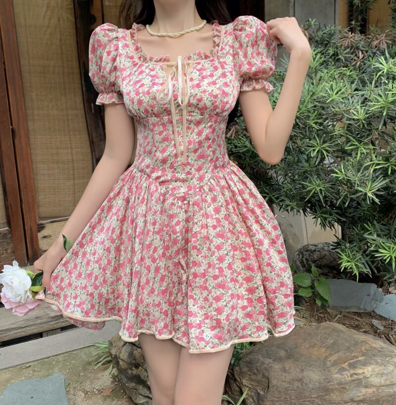 スリーブウェスト薄手フローラルドレス レース 大人ガーリー スウィート キュート カジュアル 花柄 レースアップ スクウェア ハンチェンe23708569005