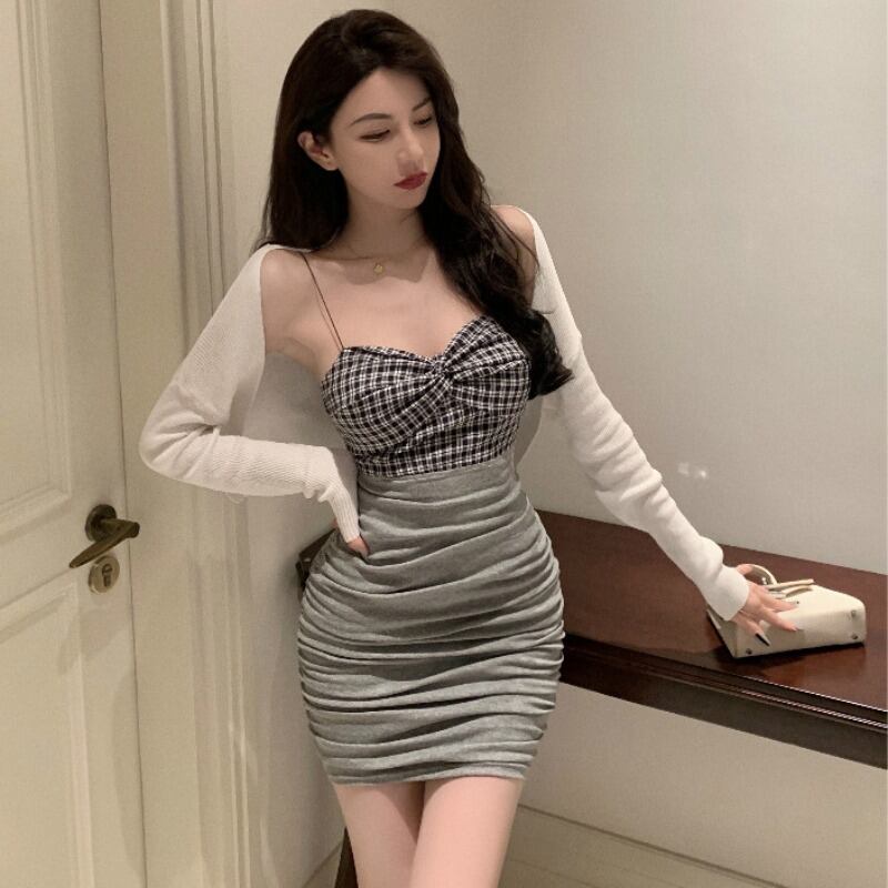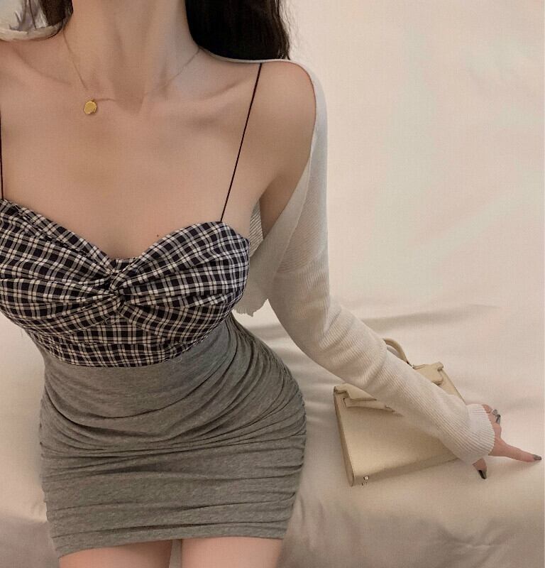 トップス 格子柄スリムドレス ニットカーディガン ステッチ ハンチェンe57401712115