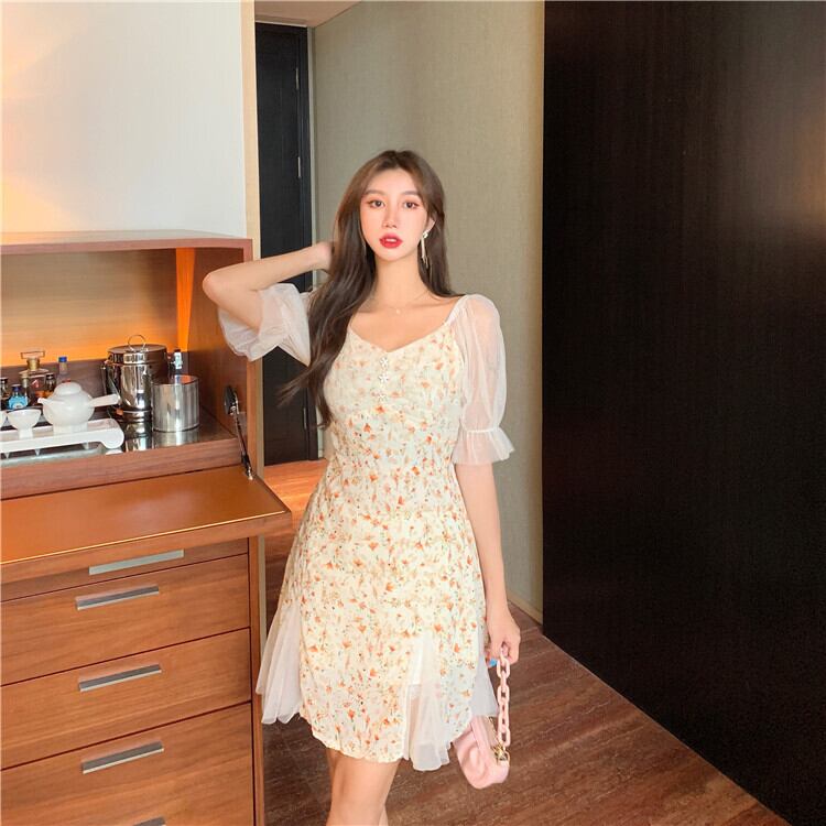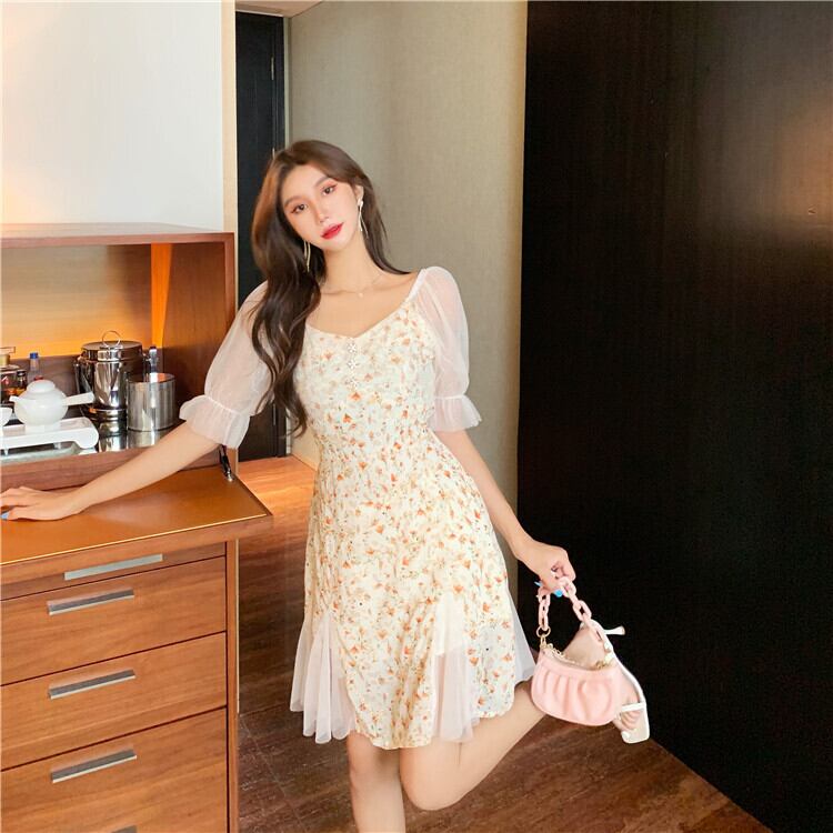 メッシュウェストAラインショートスカート スタンダードスリーブフローラルドレス レトロ 花柄 スクウェア ステッチ ハンチェンe63644467158