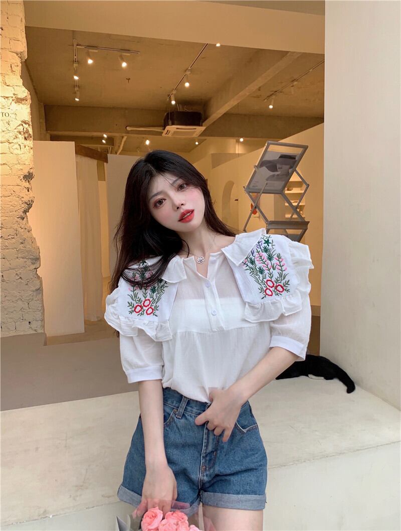 刺繍ルーズシャツ トップス レディース ランタンスリーブ ハンチェンe91895030344
